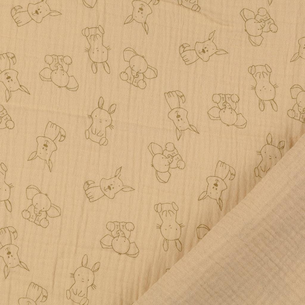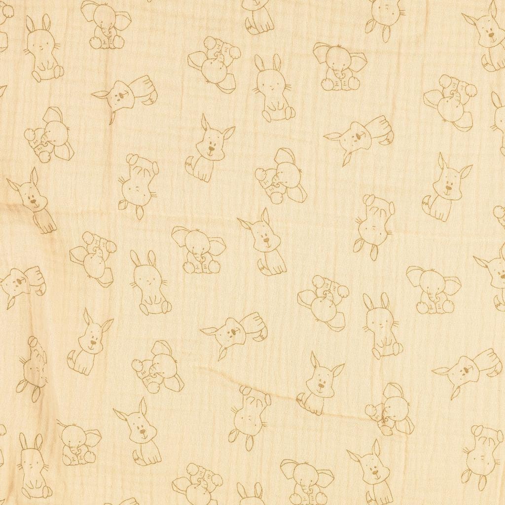 Baumwoll Musselin Stoff Druck in taupe mit Tieren - Elefant, Hund, Hase - dezentes Muster
