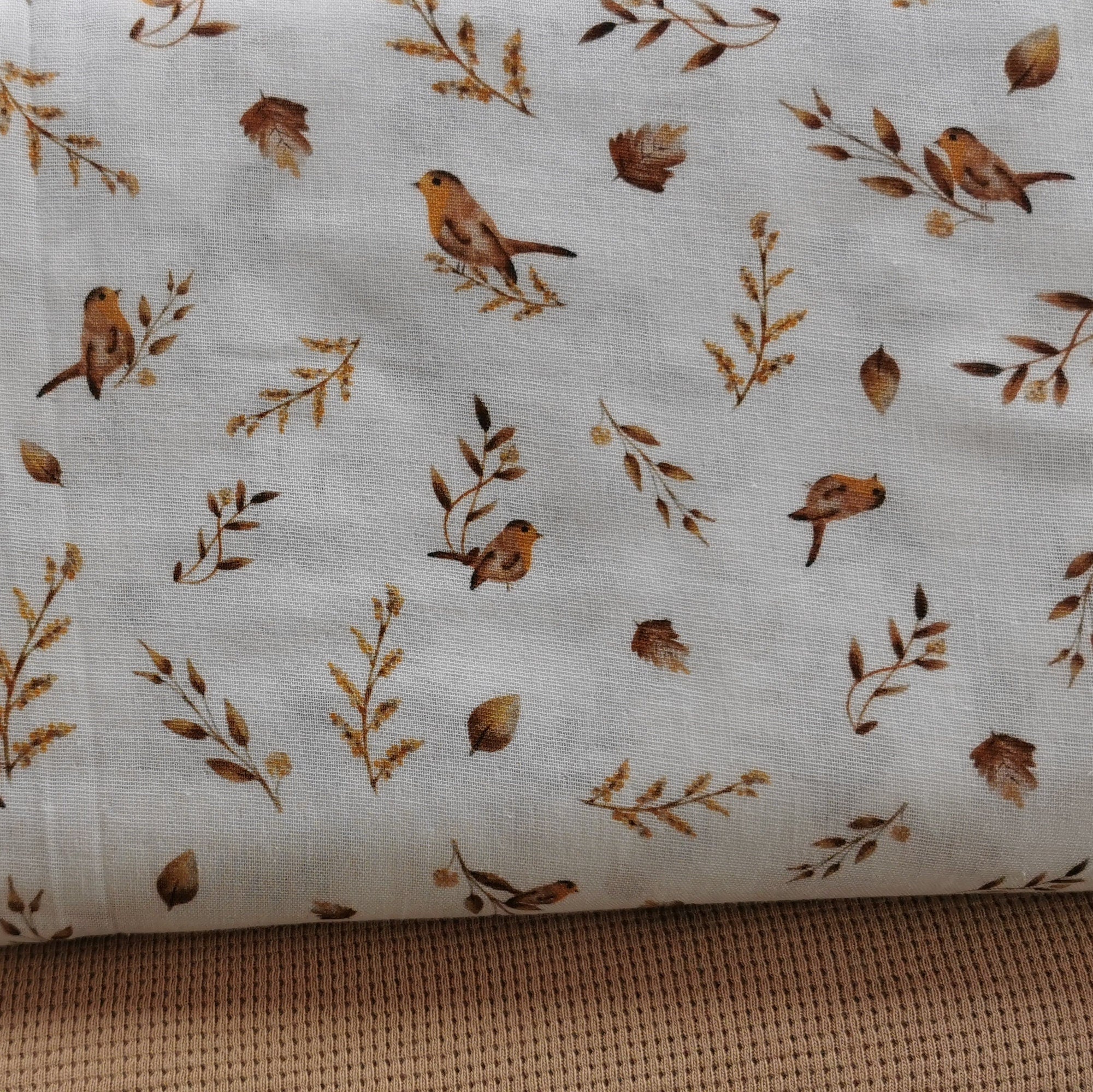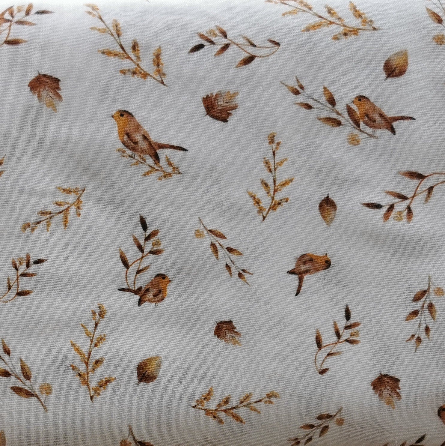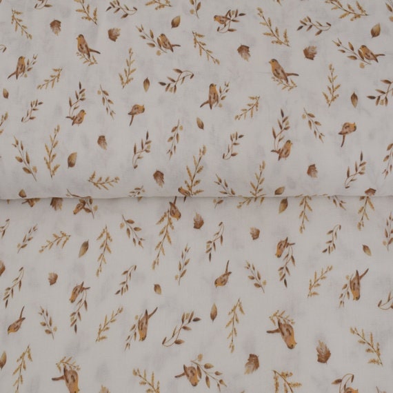 Baumwoll Musselin Stoff Druck -Zweige, Blätter & Vögel- weiß/braun