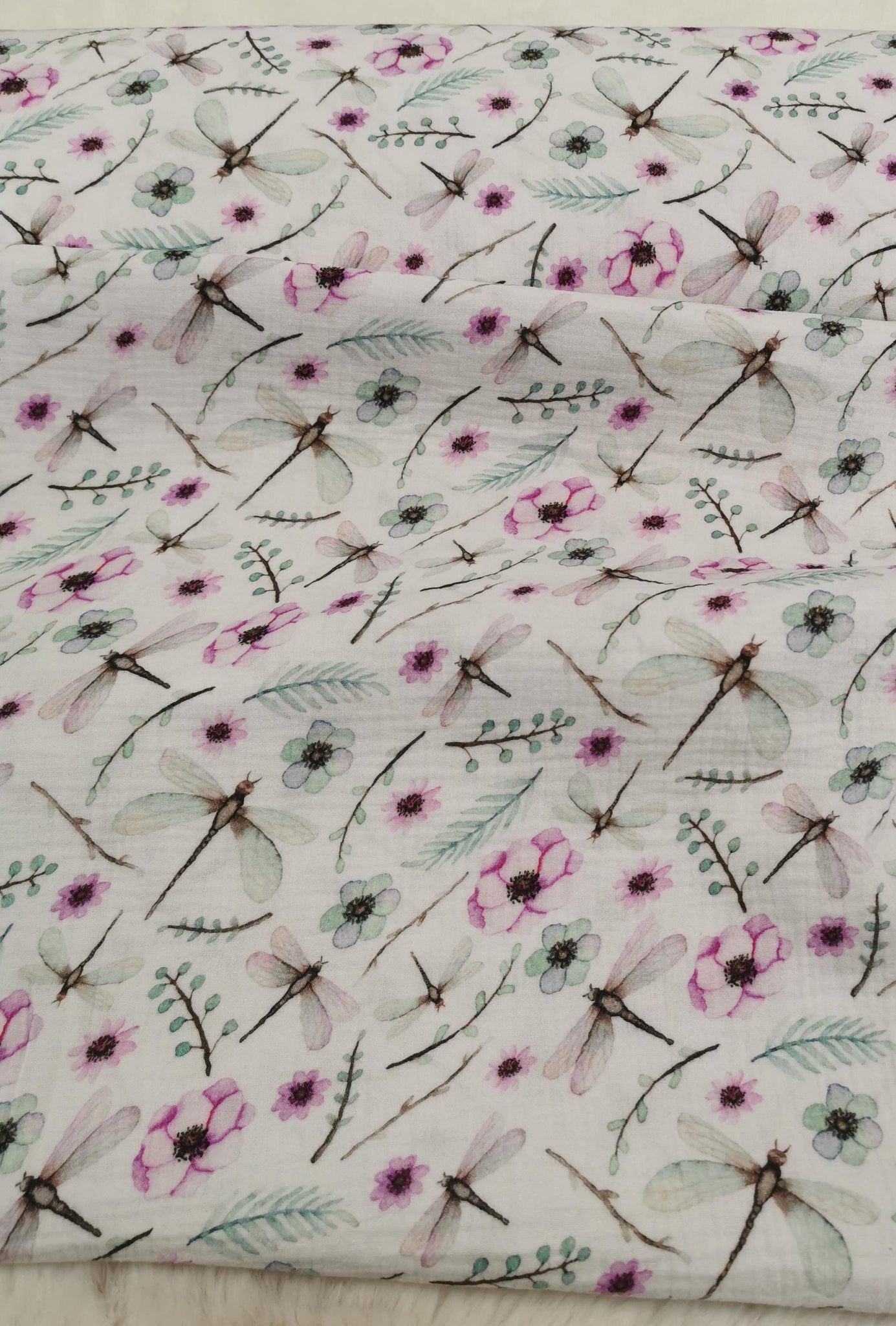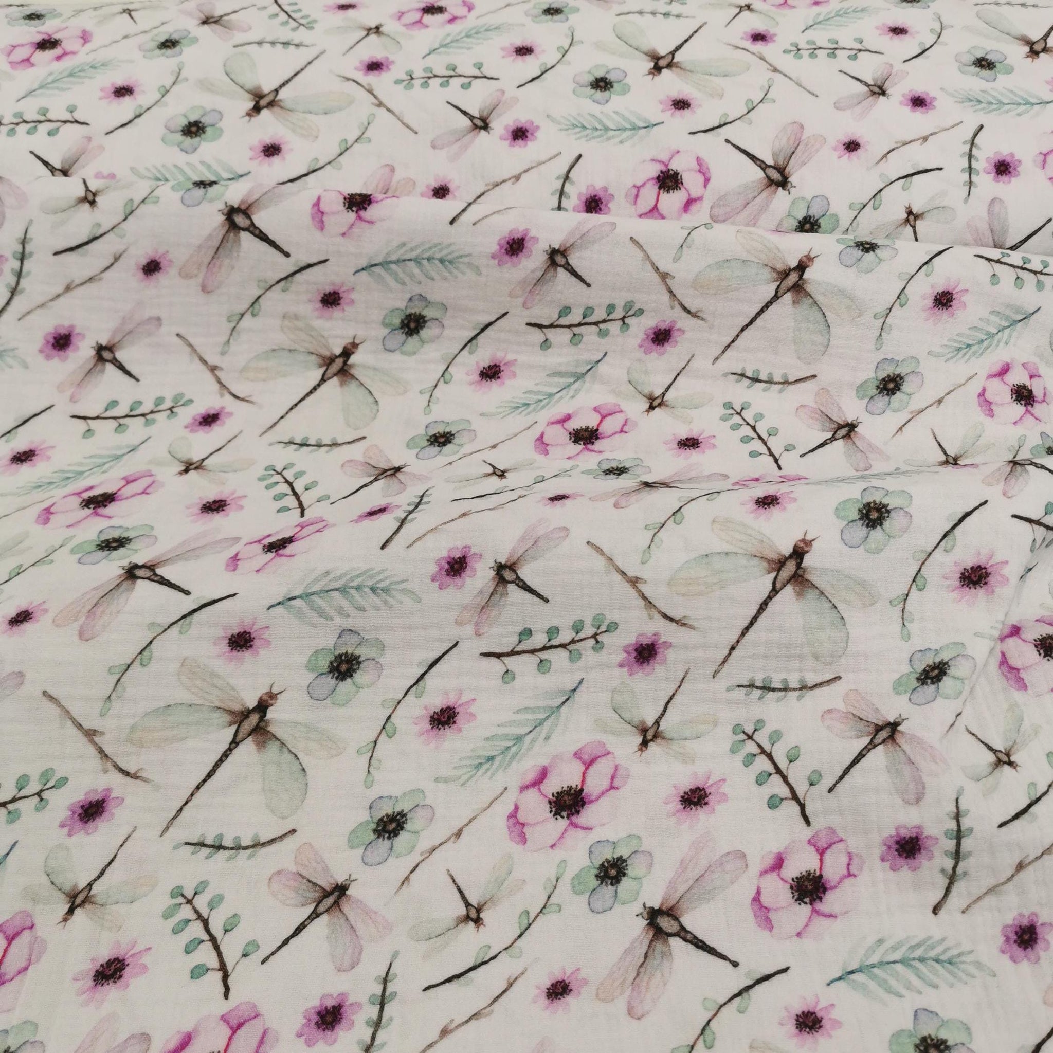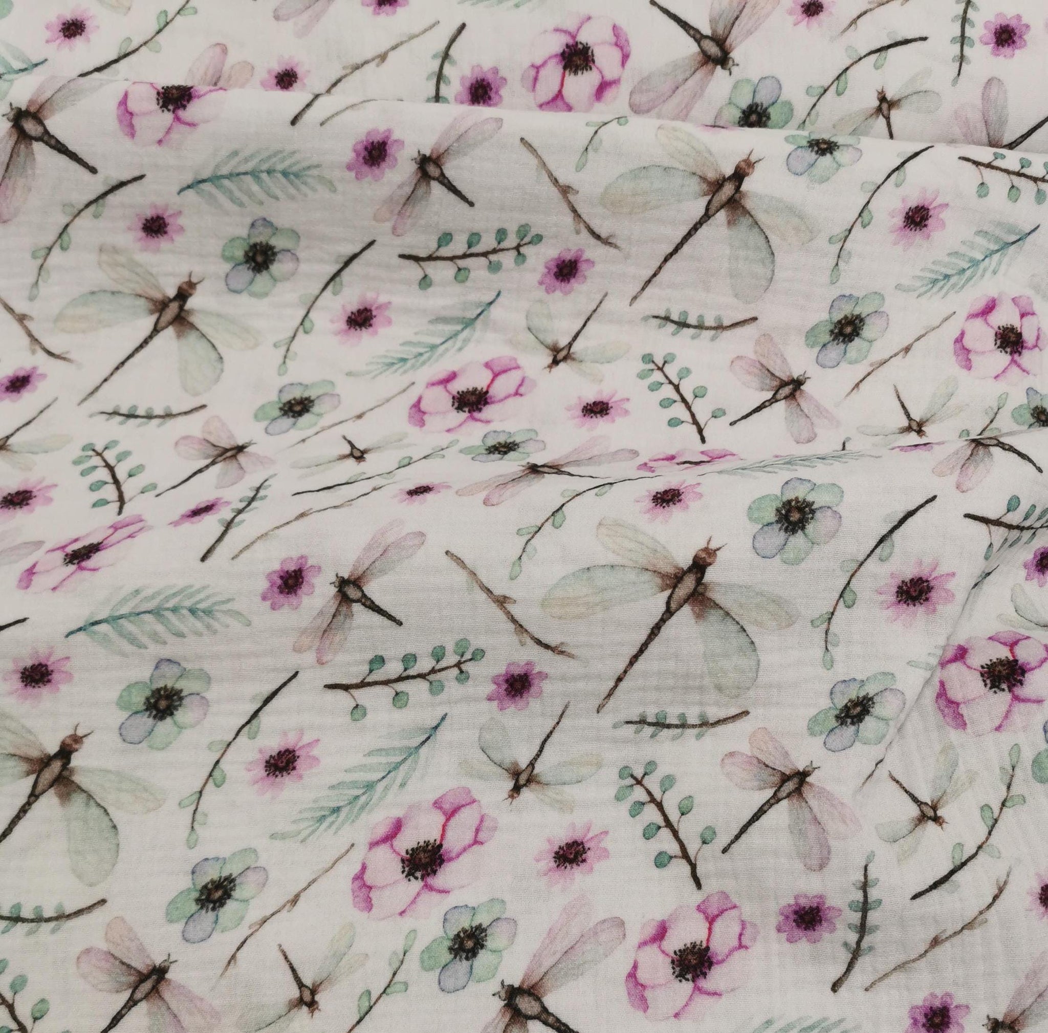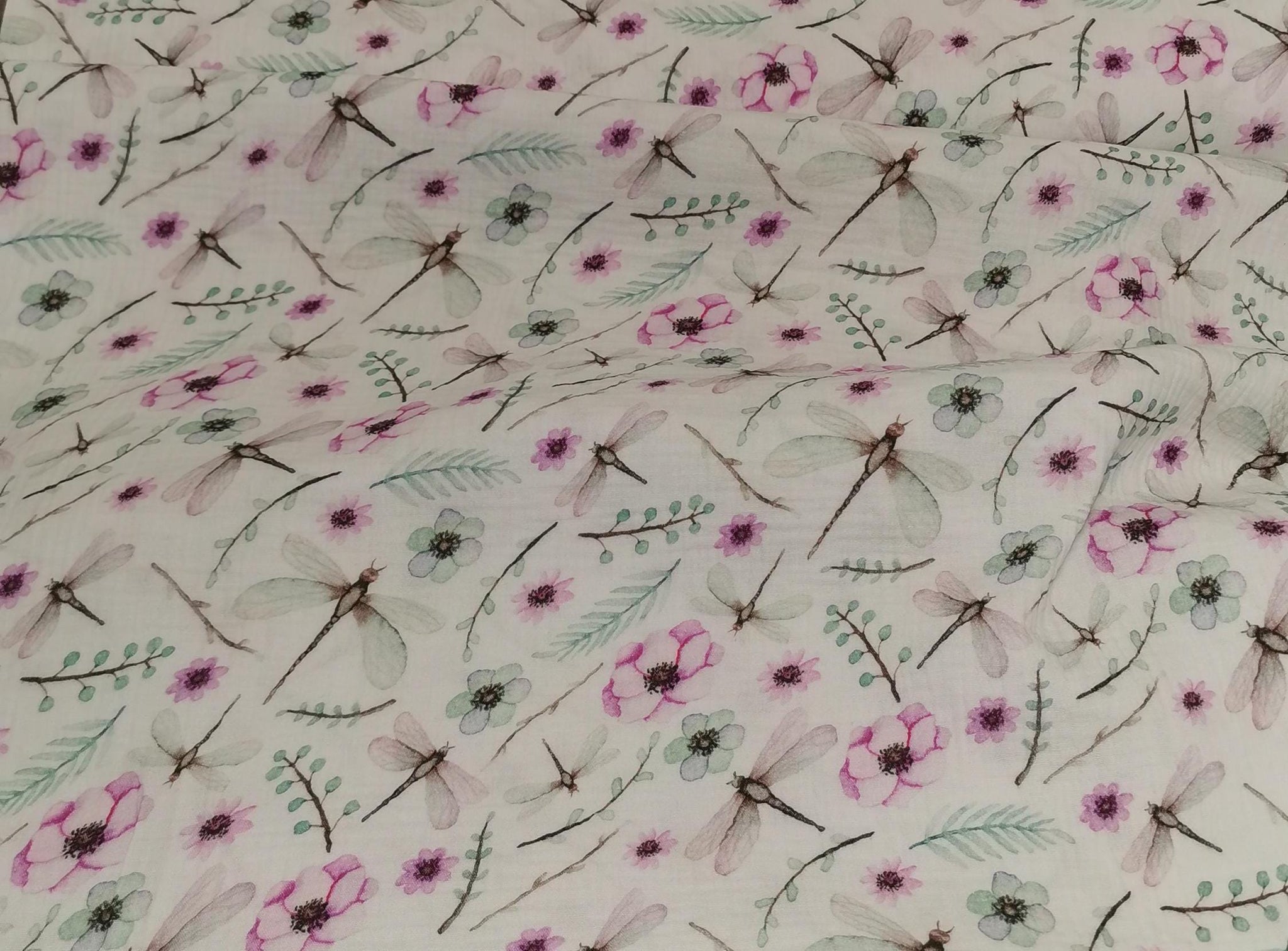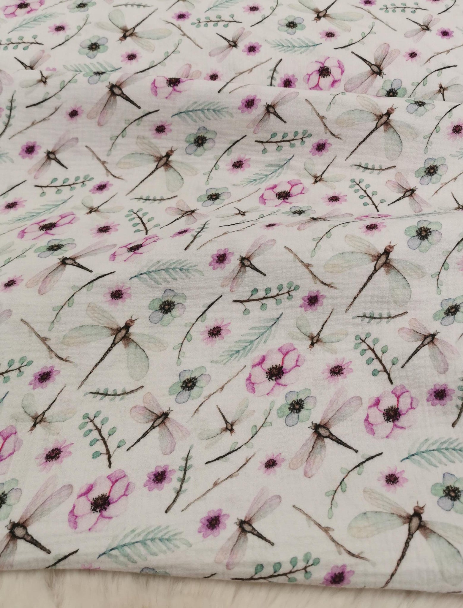 Baumwoll Musselin Stoff "Libellen" weiß mit grünen Zweigen und bunten Blüten | Fräulein von Julie