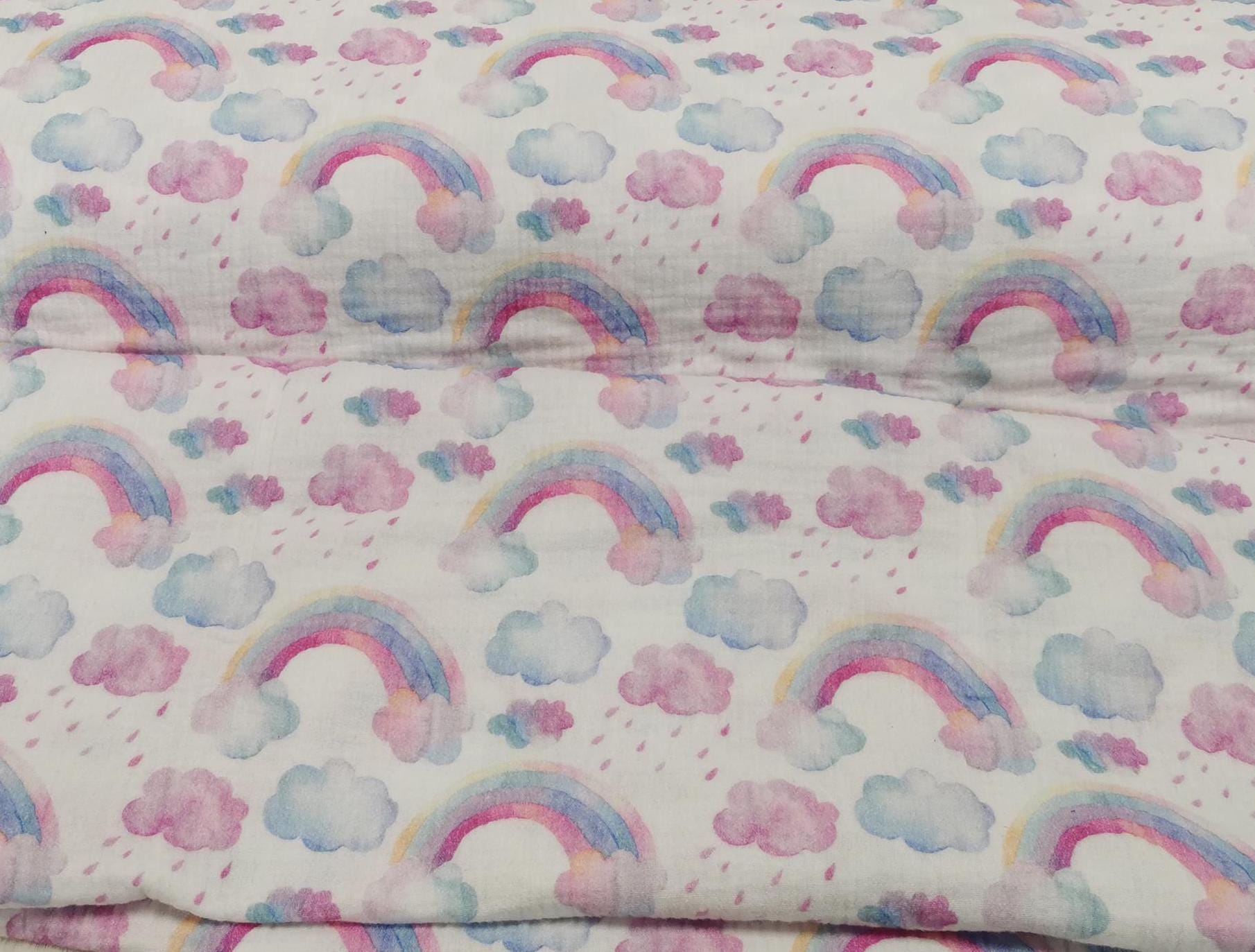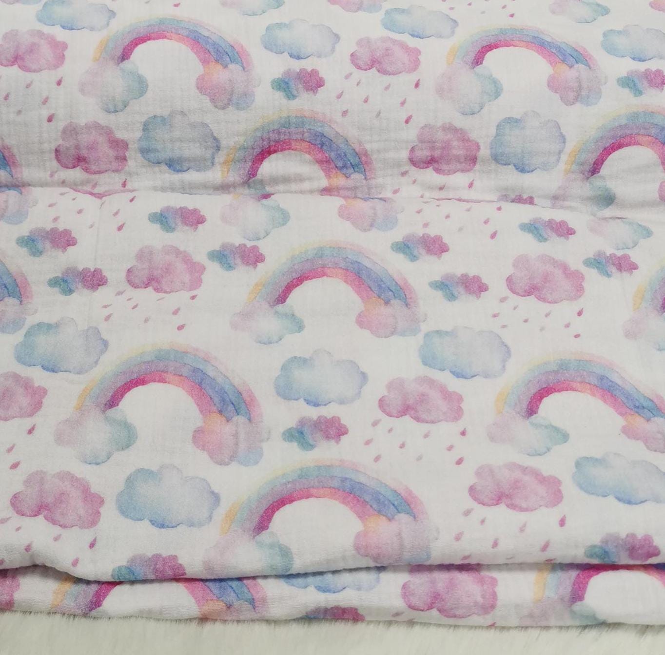 Baumwoll Musselin Stoff "Regenbogen" weiß mit pastellfarbenen Regenbögen und Wolken | Fräulein von Julie