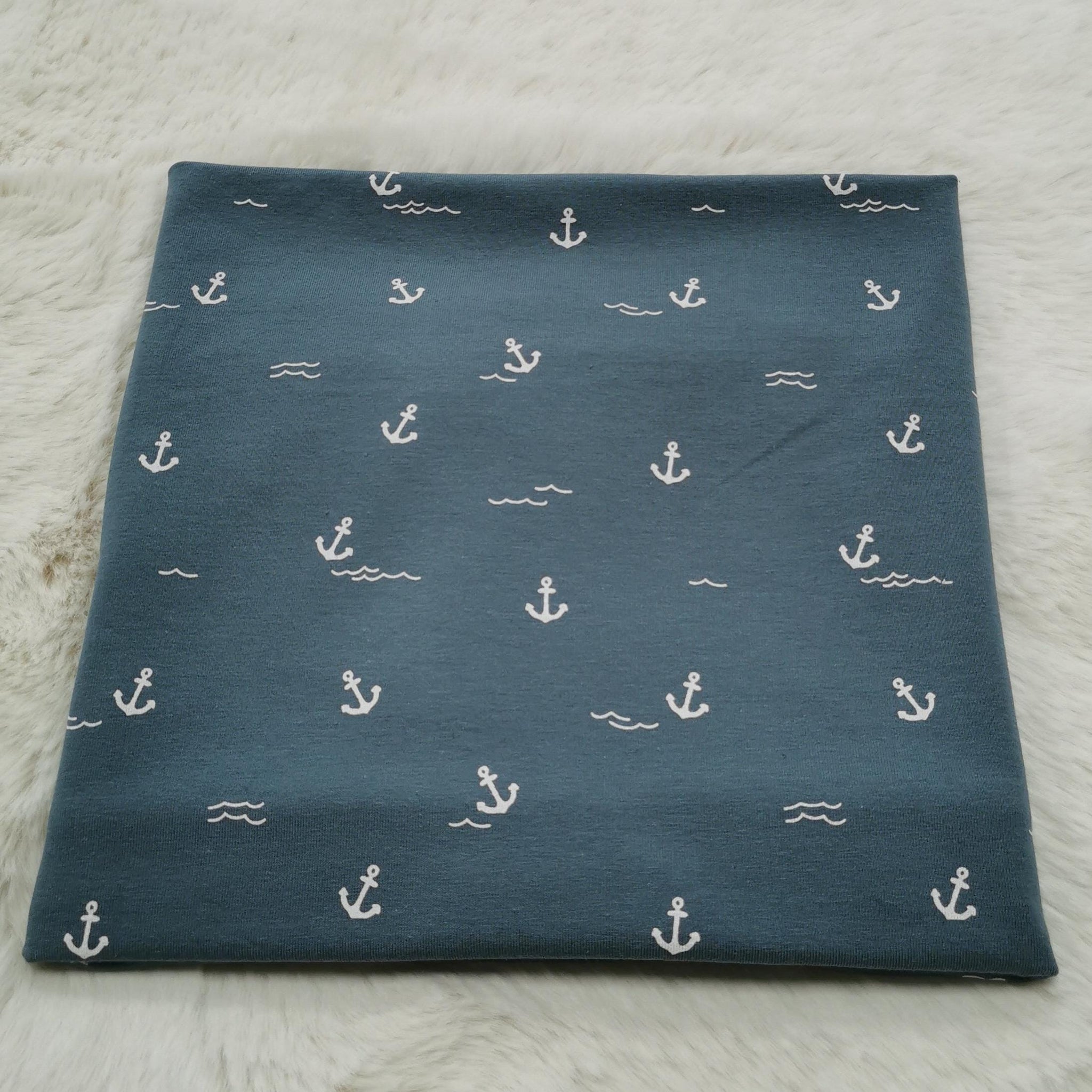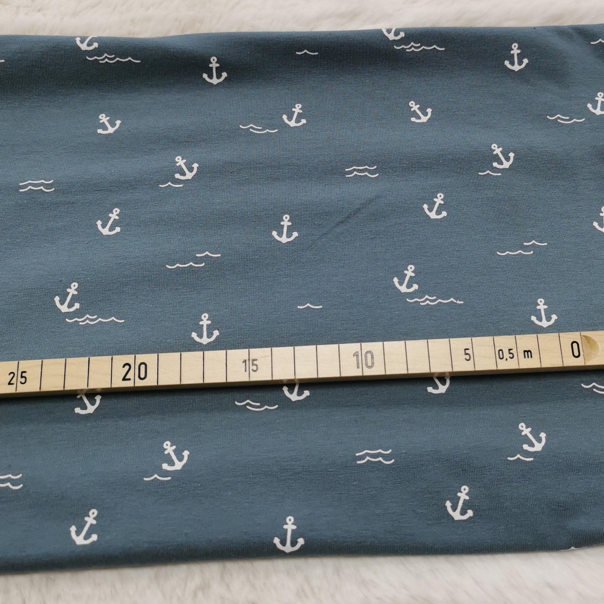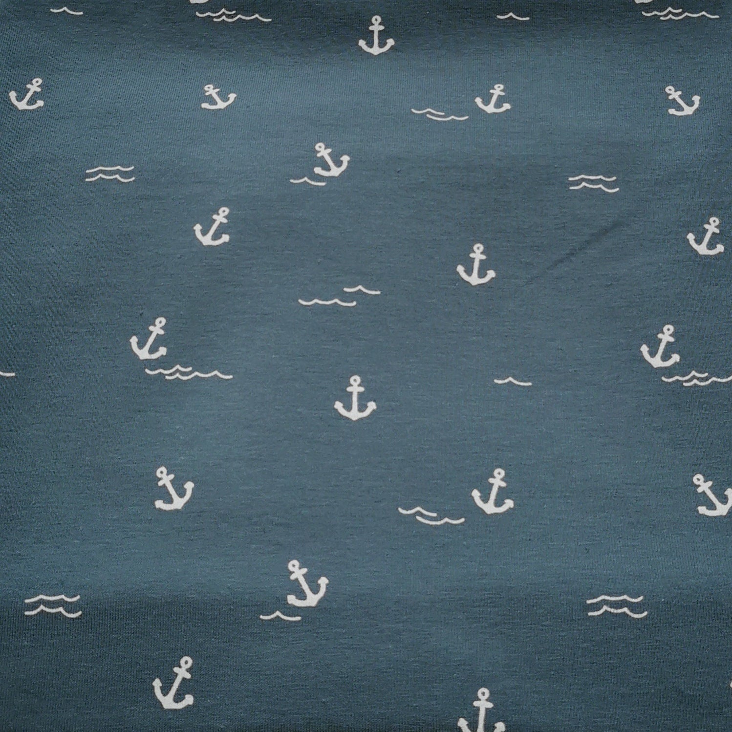 Baumwolljersey Druck grau-blau mit dezenten weißen Ankern und Wellen