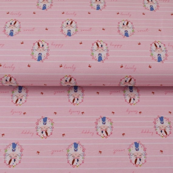 Hier gibt es den passenden schönen rosanen Baumwoll Jersey mit niedlichen kleinen Oster Hasen/Häschen.