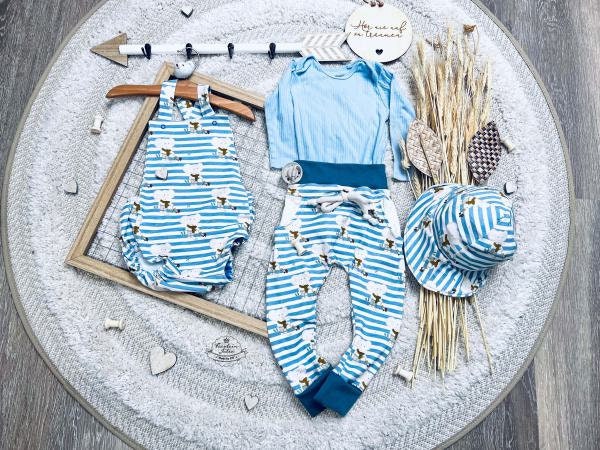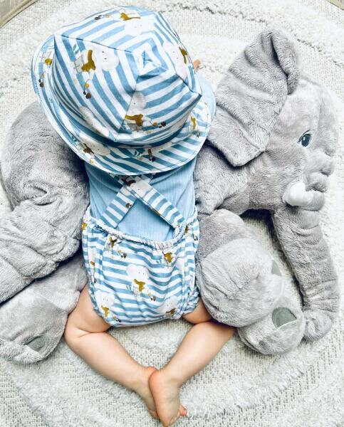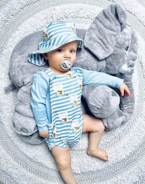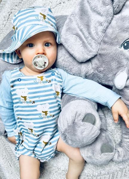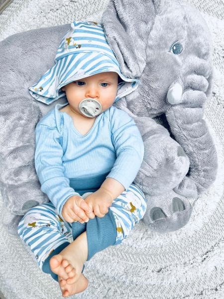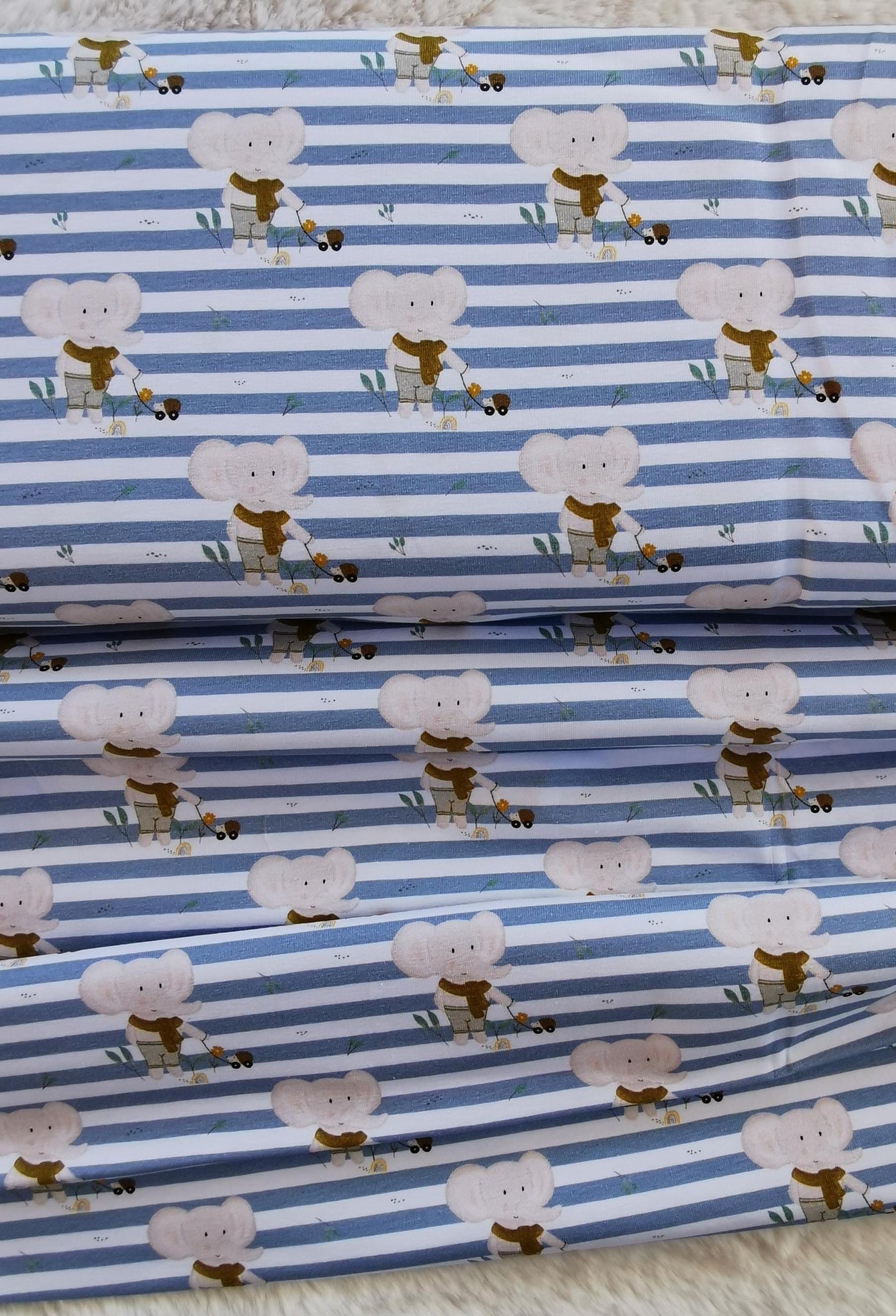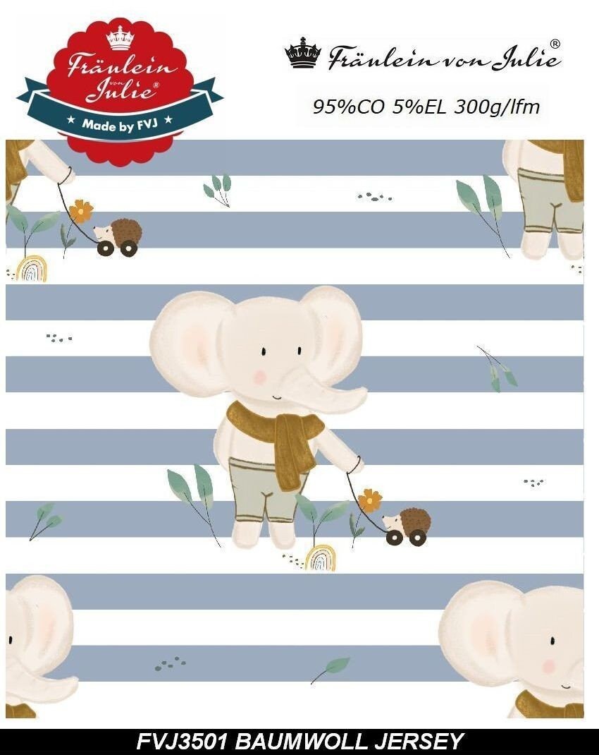 Baumwolljersey Druck kleiner Elefant mit brauner Hose und braunem Schal, auf weißem Grund mit grauen Streifen | Fräulein von Julie