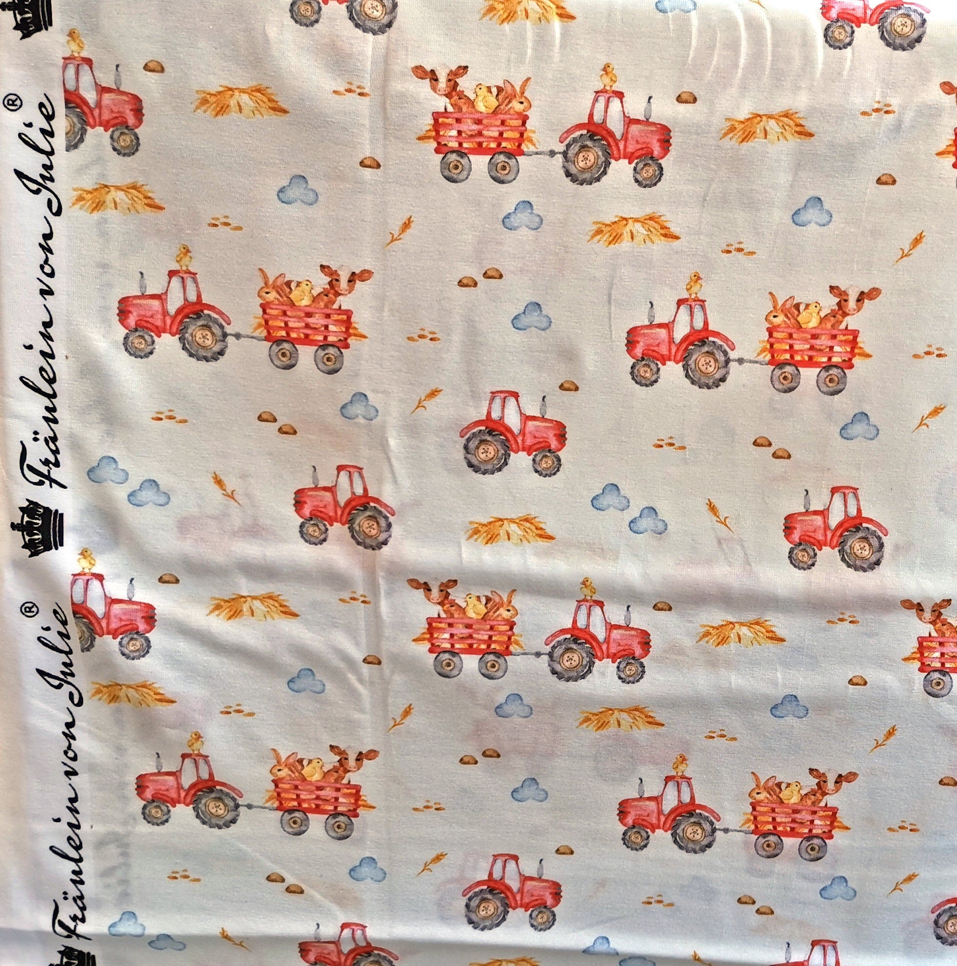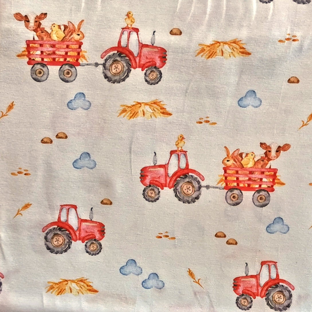 Baumwolljersey Druck roter Traktor mit Bauernhoftieren auf weißem Hintergrund | Fräulein von Julie