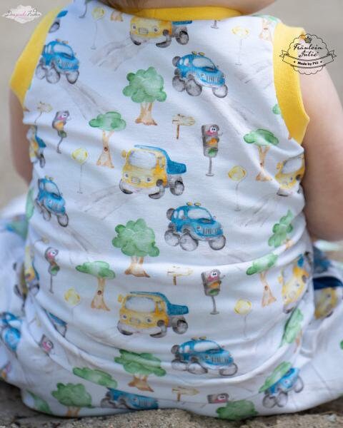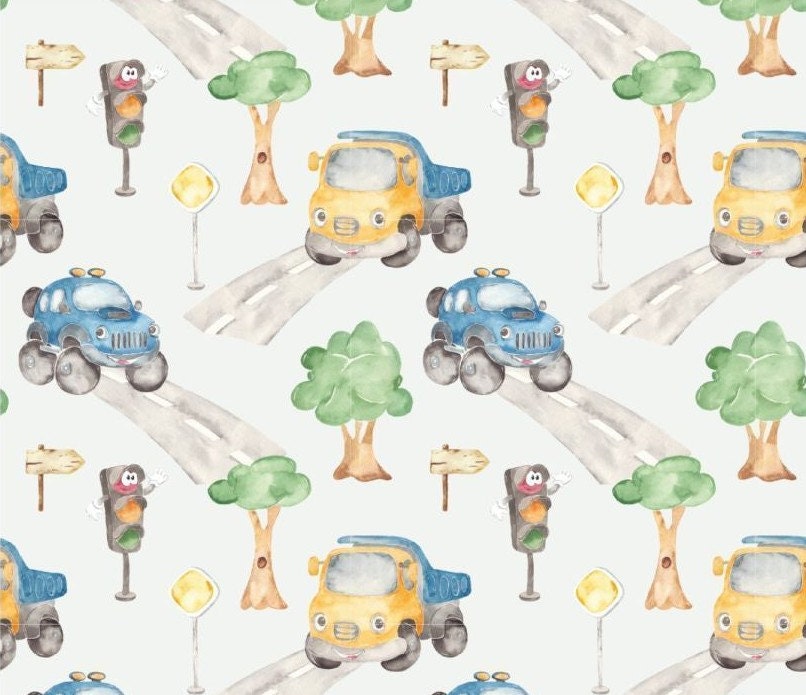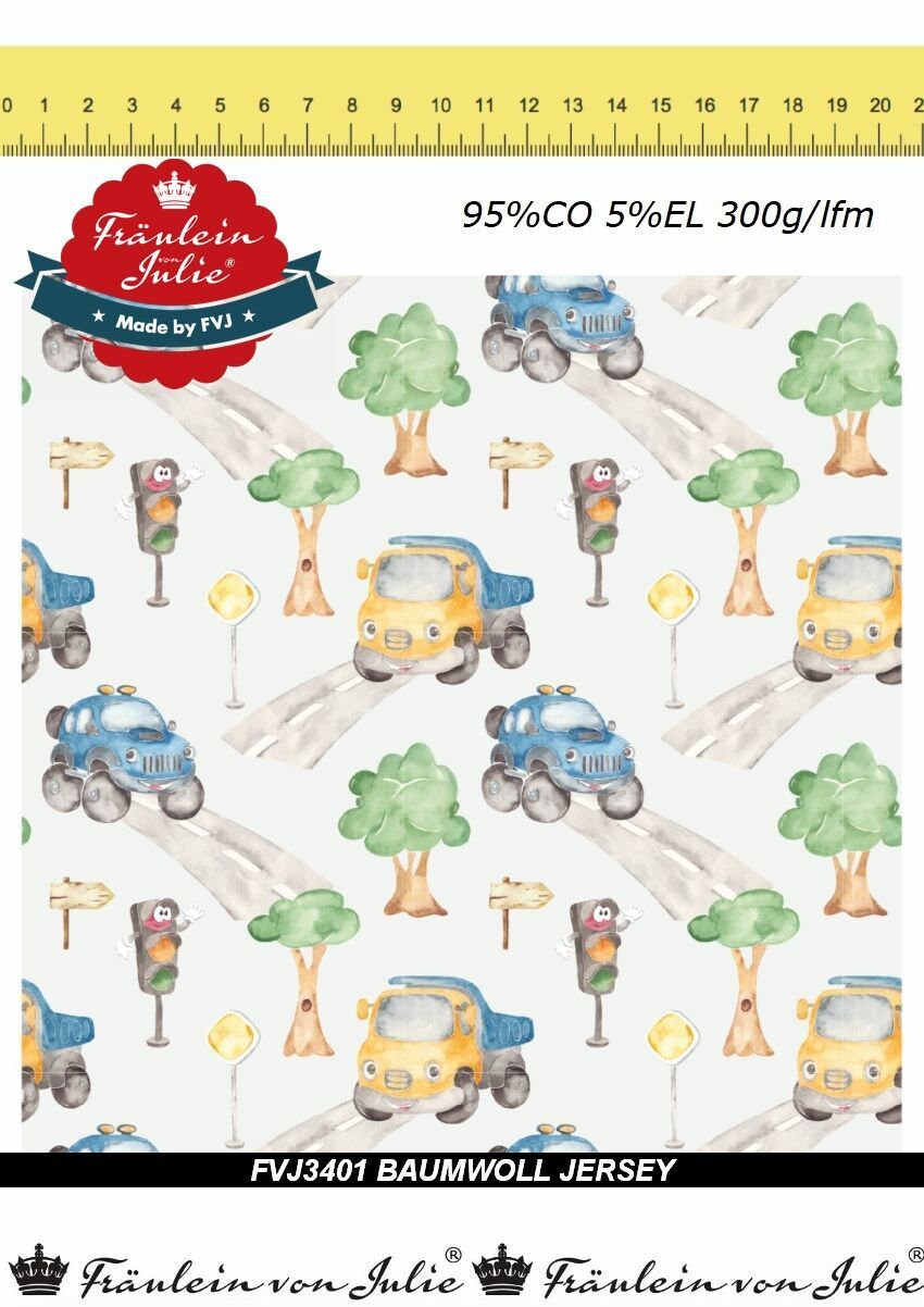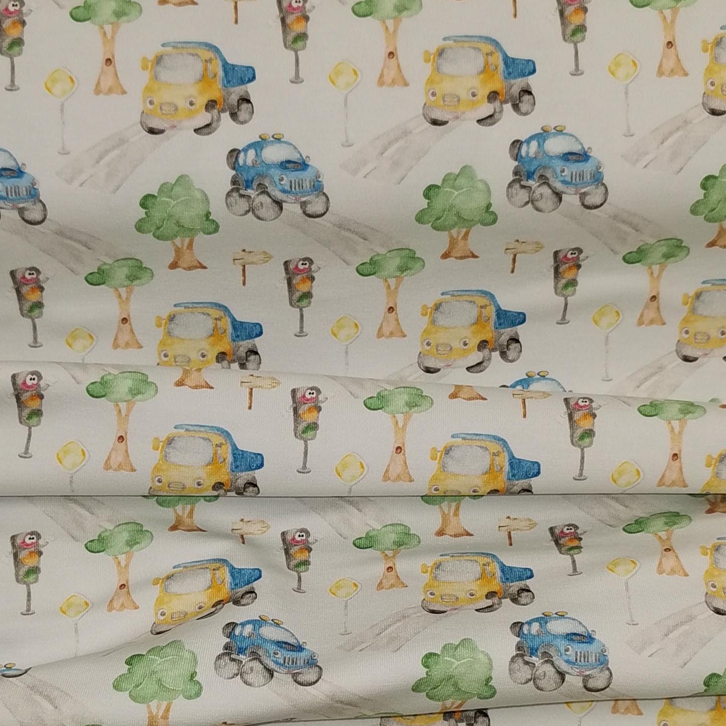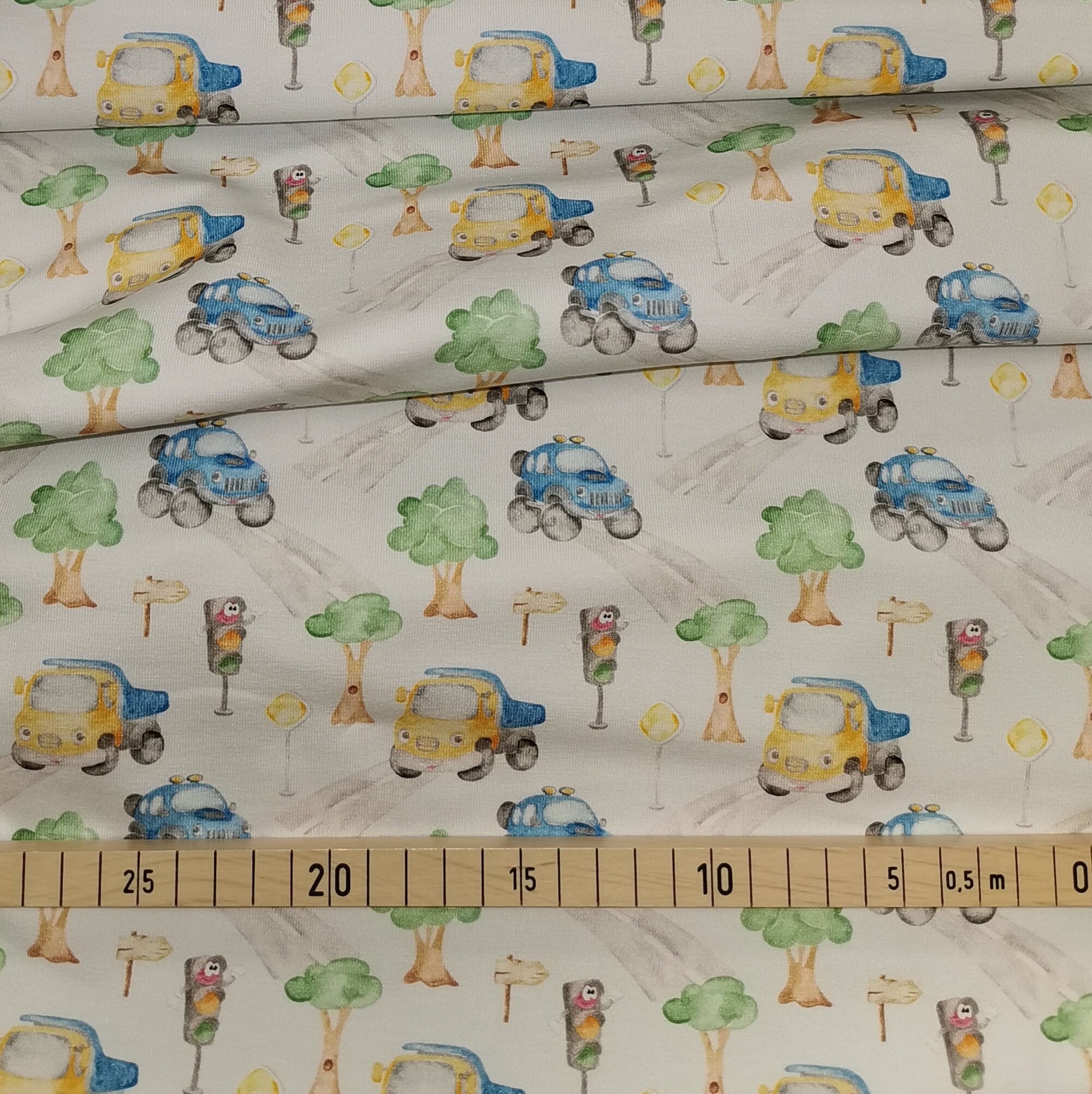 Baumwolljersey Druck Straßenverkehr mit Lastern, Autos und Ampeln, auf weißem Hintergrund | Fräulein von Julie
