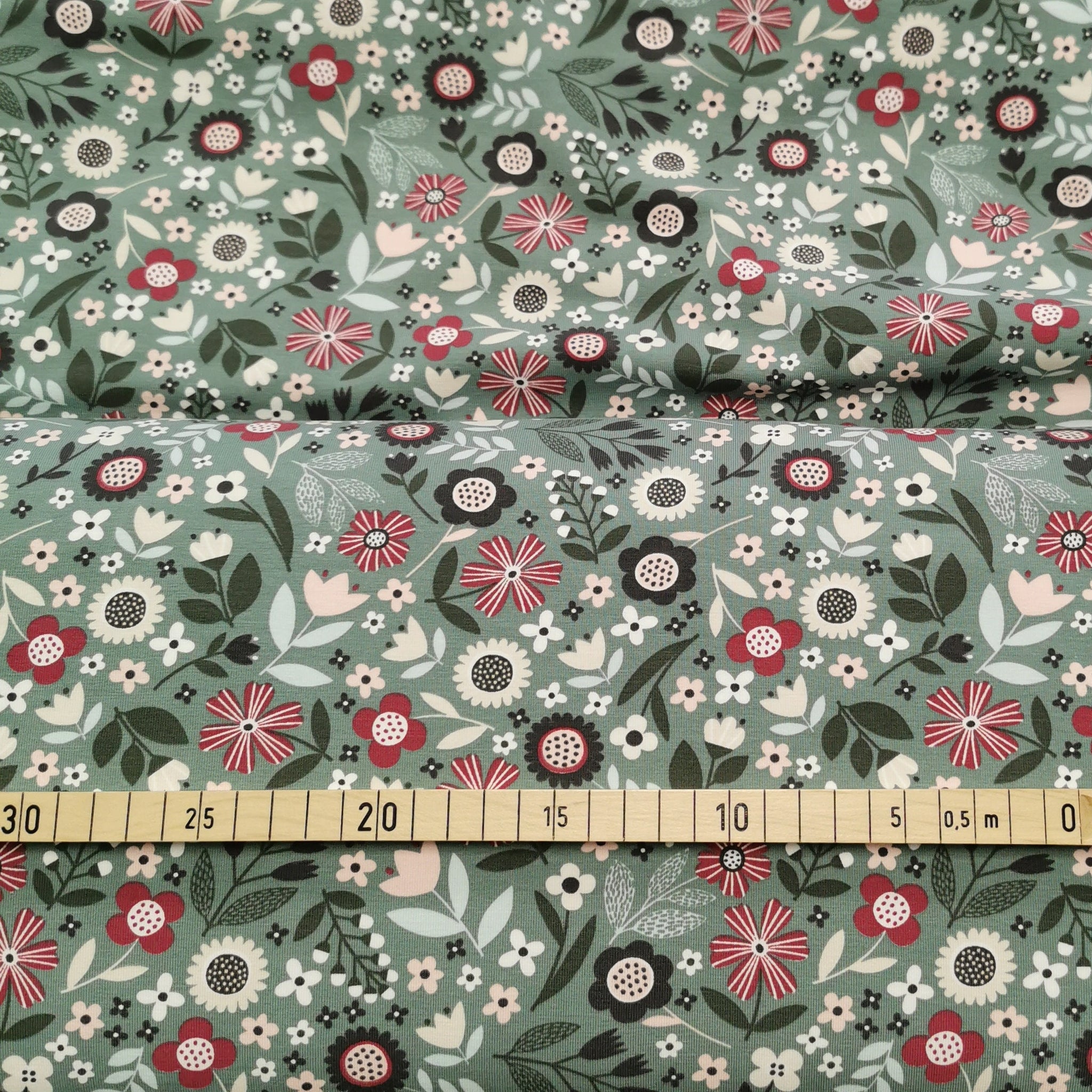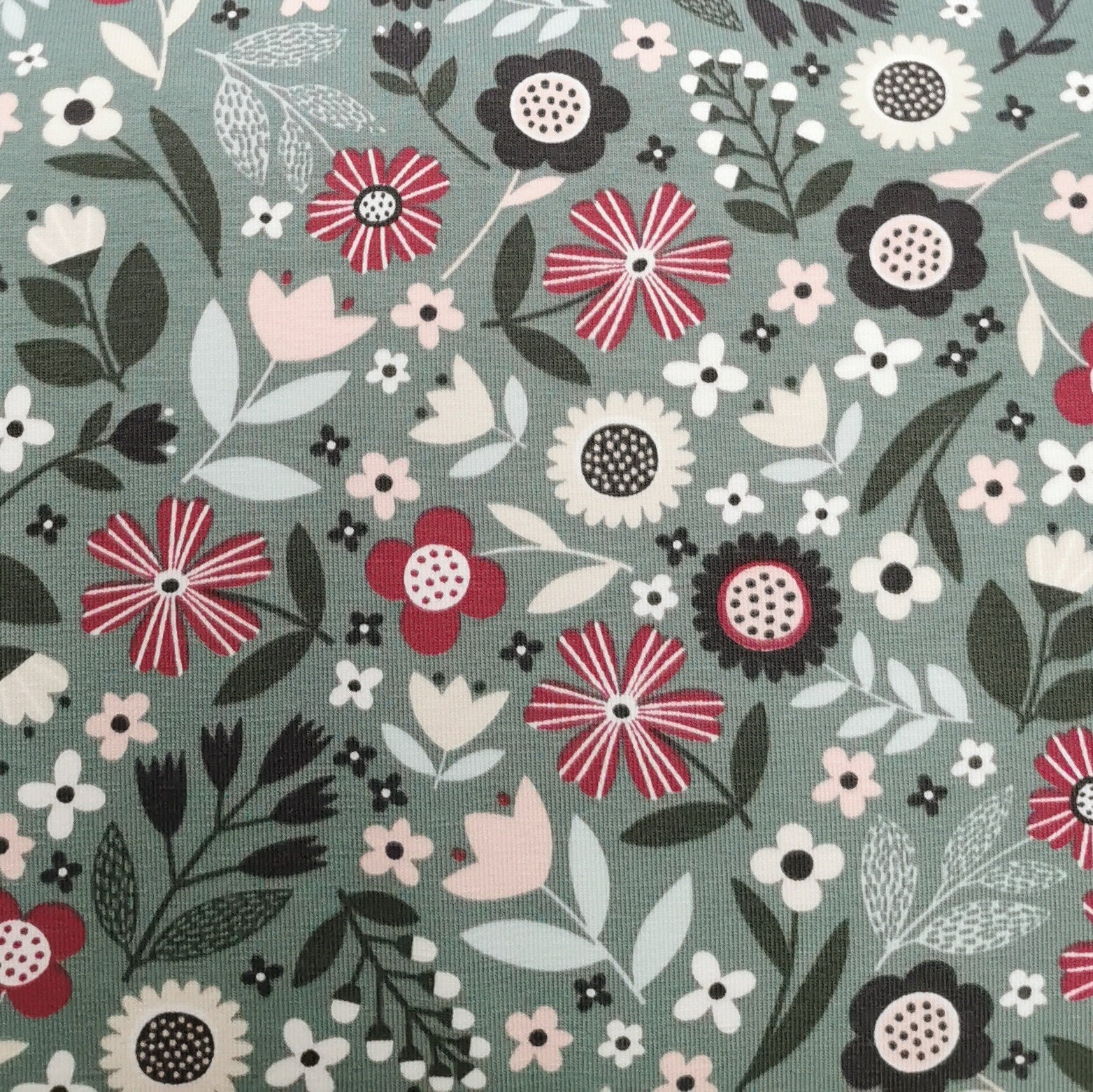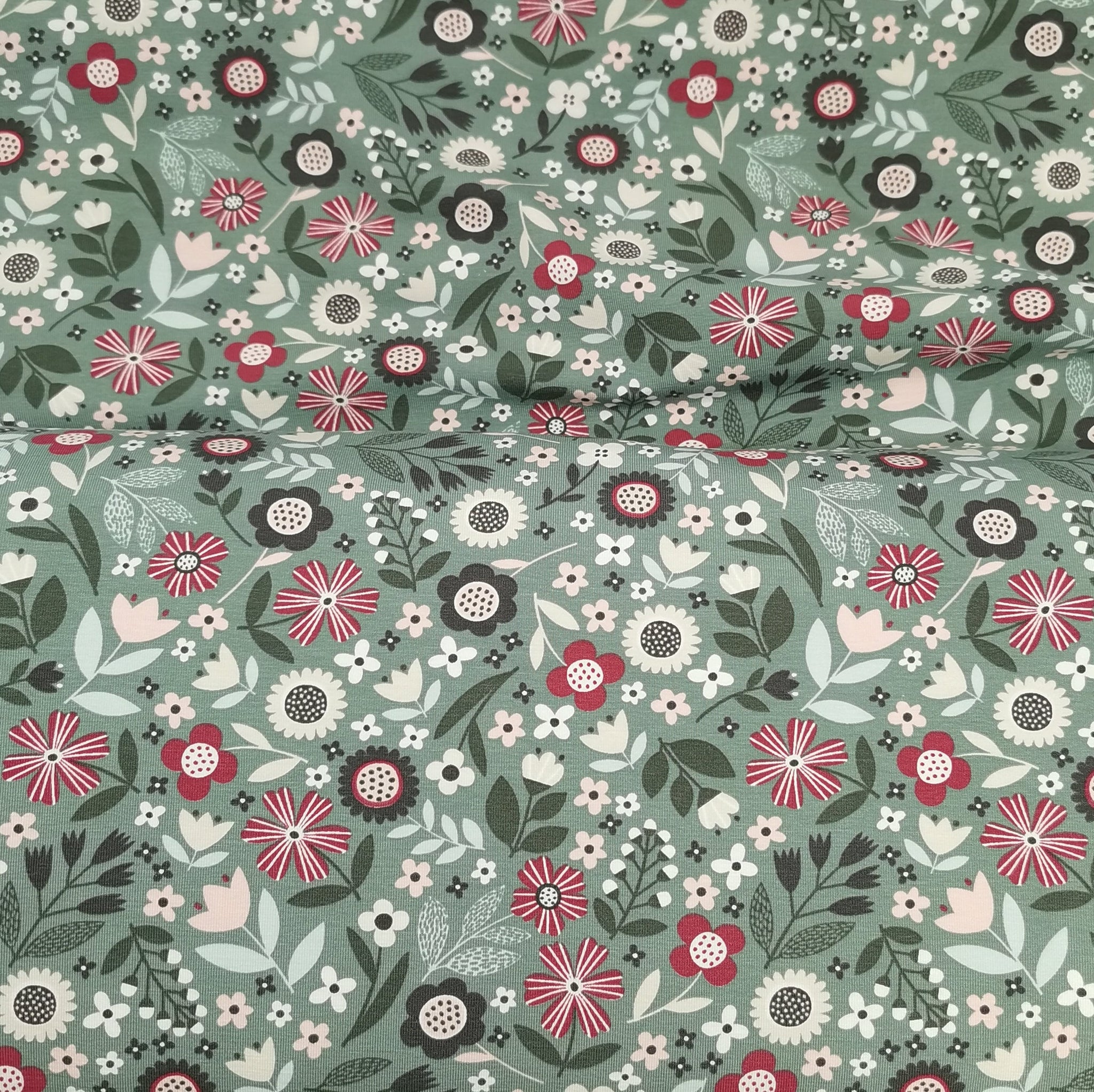 Baumwolljersey mit roten und grünen Blumen auf hellgrünem Hintergrund