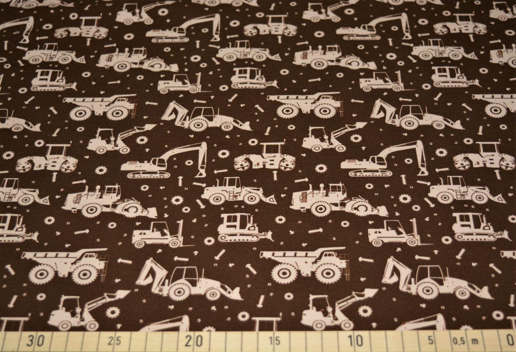 Baumwolljersey "Ronny" mit Baustellenfahrzeugen - Bagger, Radlader, Raupe, Kipper auf braunem Hintergrund