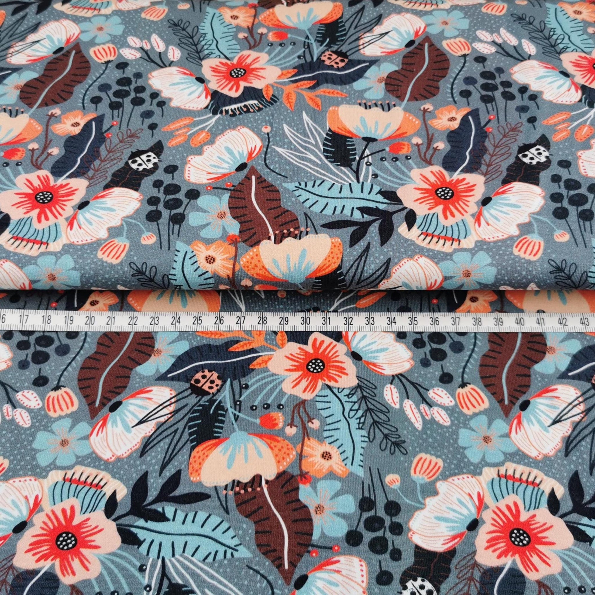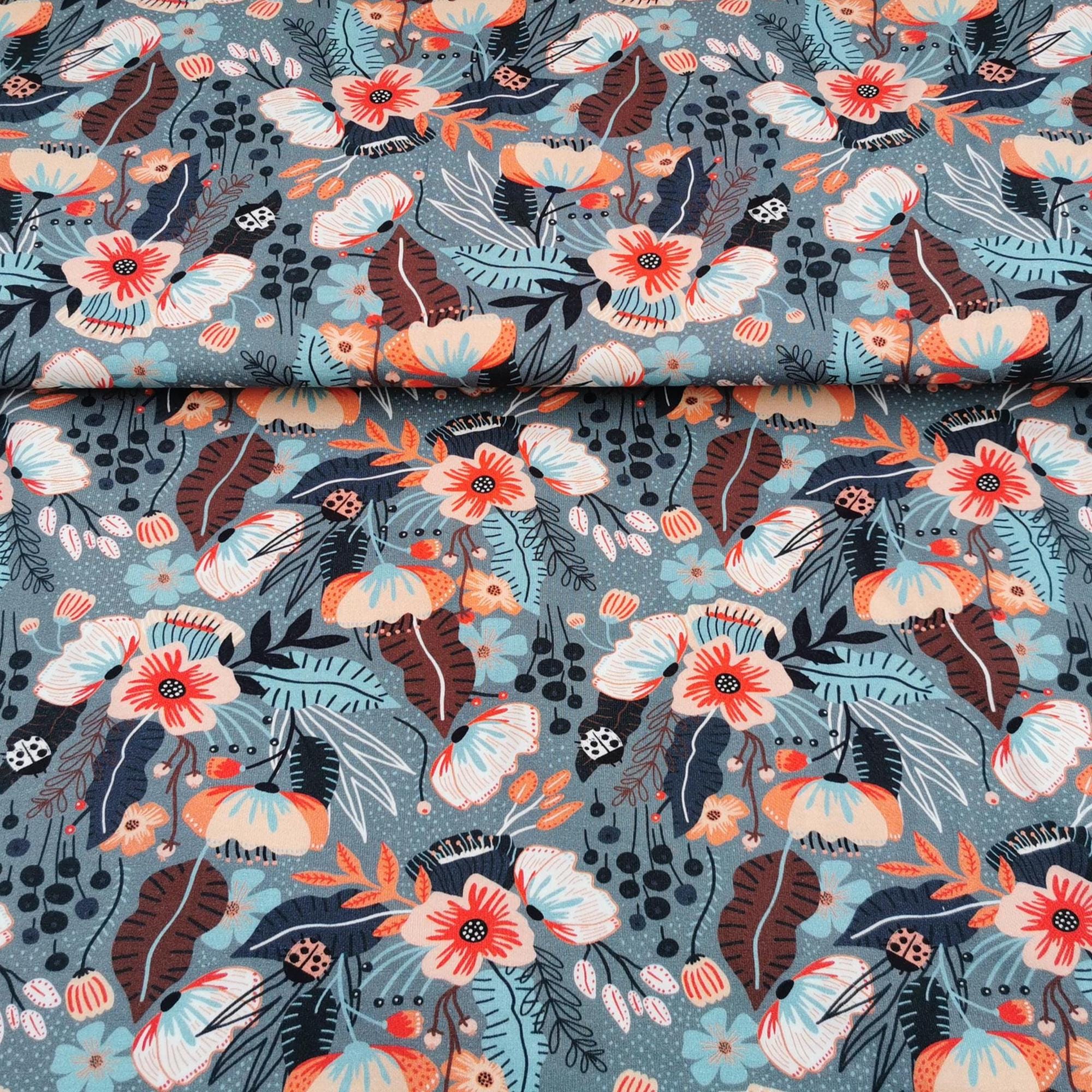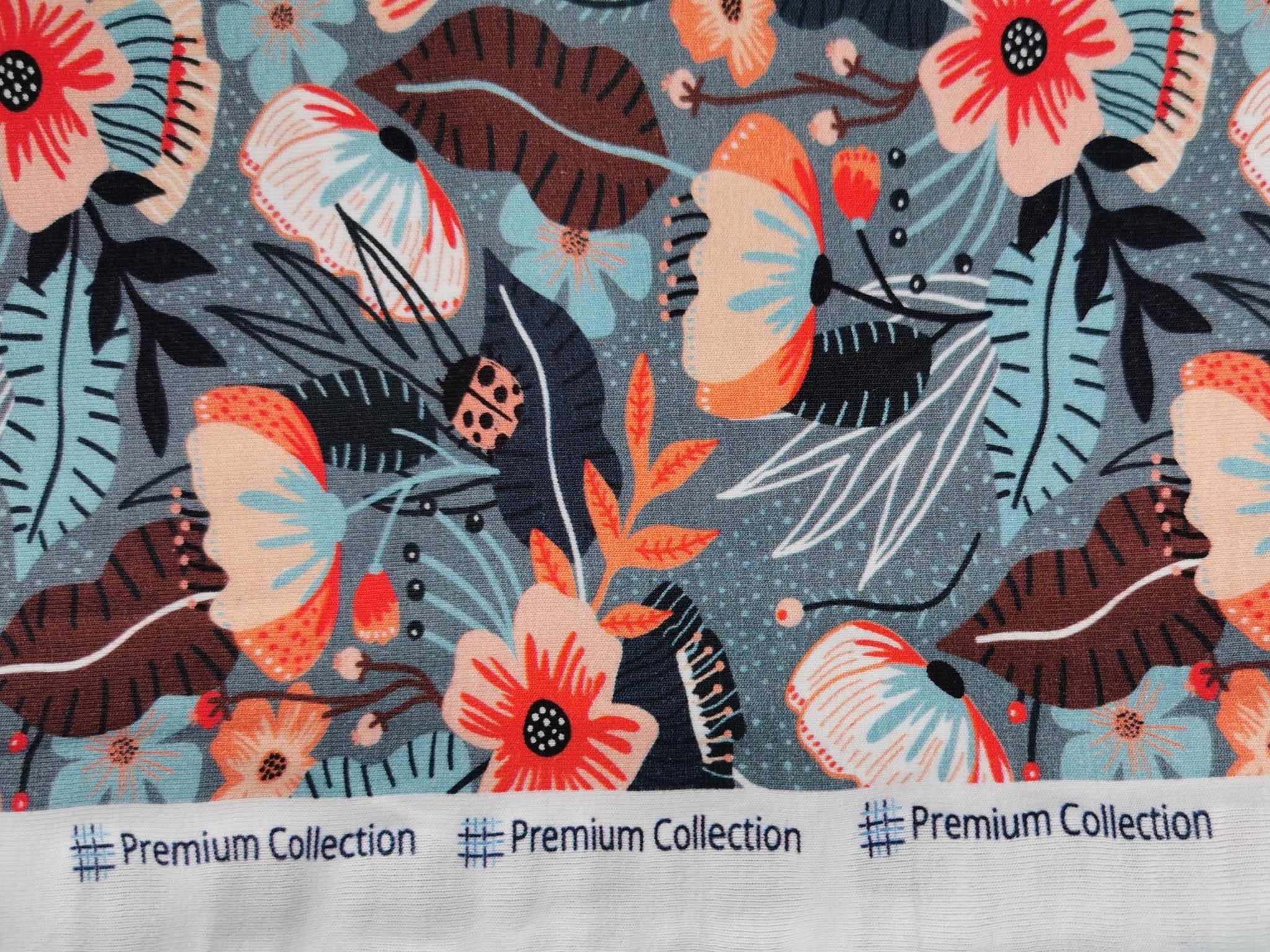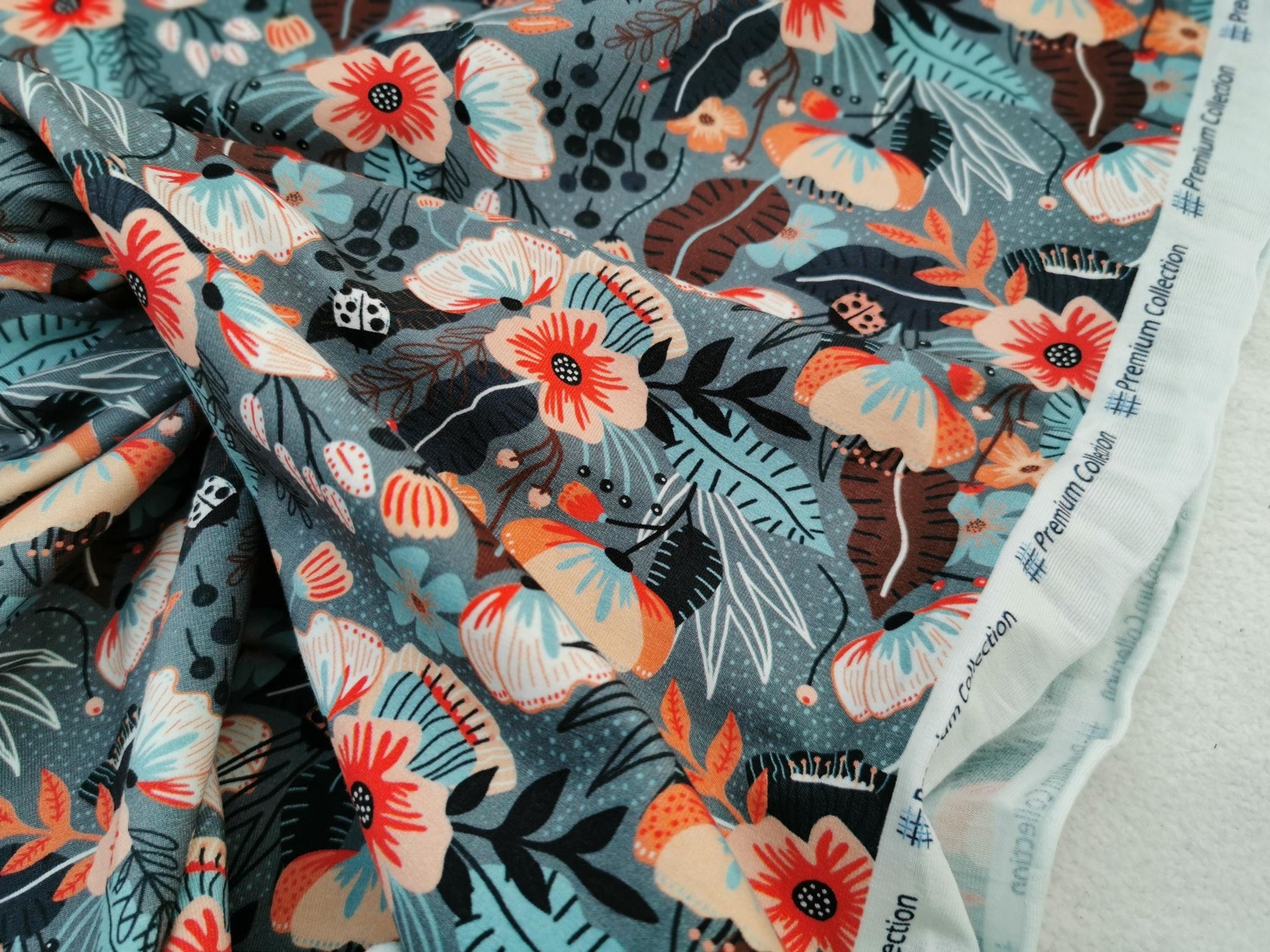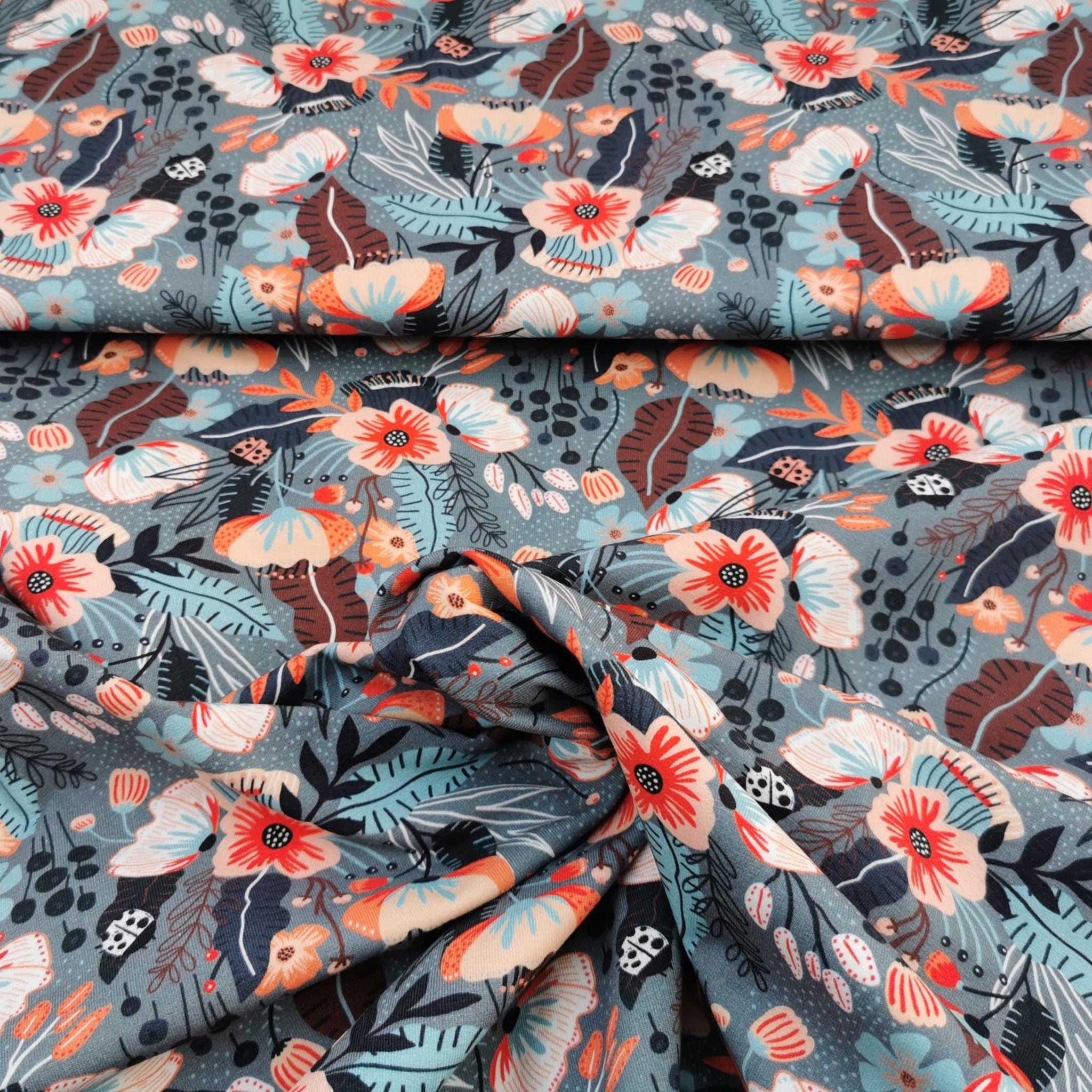 Baumwolljersey Stoff Druck - orangene Blumen, kleine Marienkäfer, grauer Hintergrund | Premium Collection