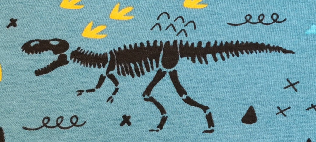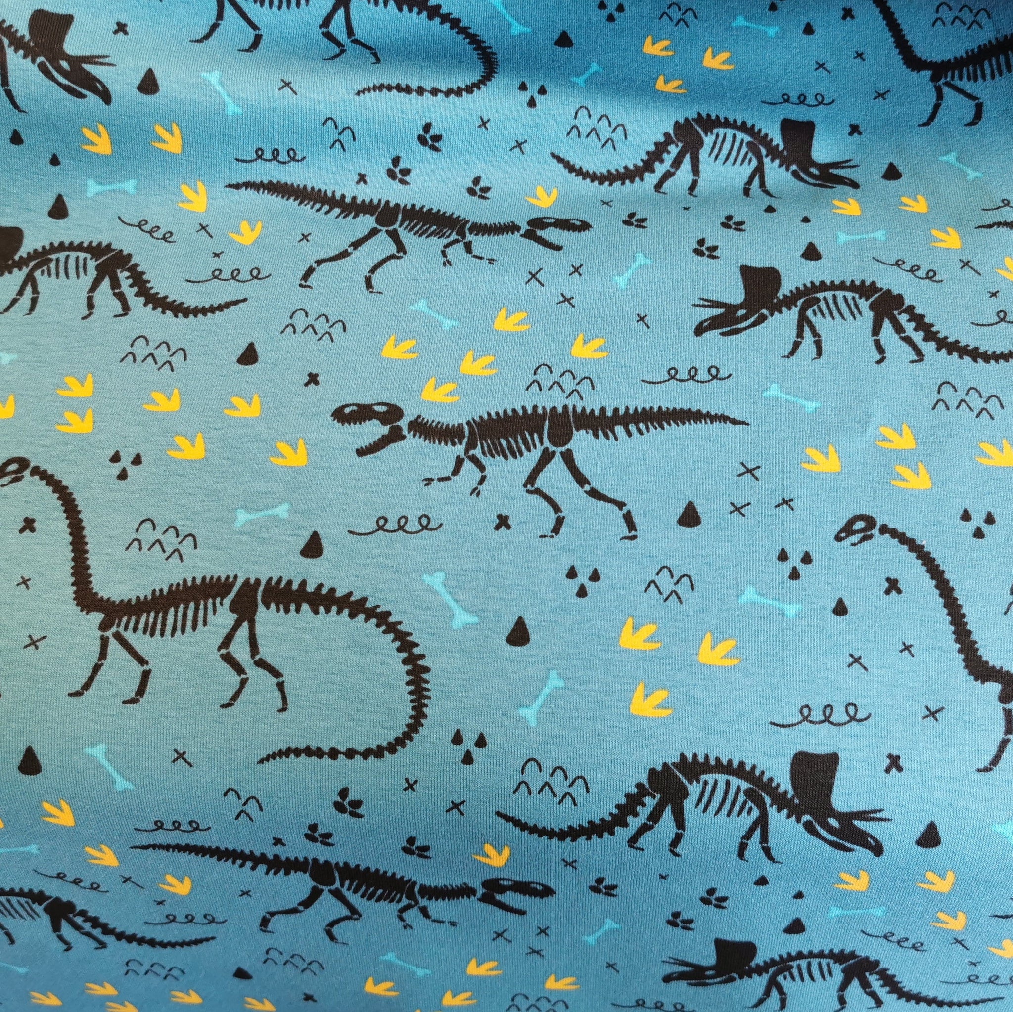 Baumwolljersey Stoff Druck schwarze Dinosaurier Skelette auf hellblau