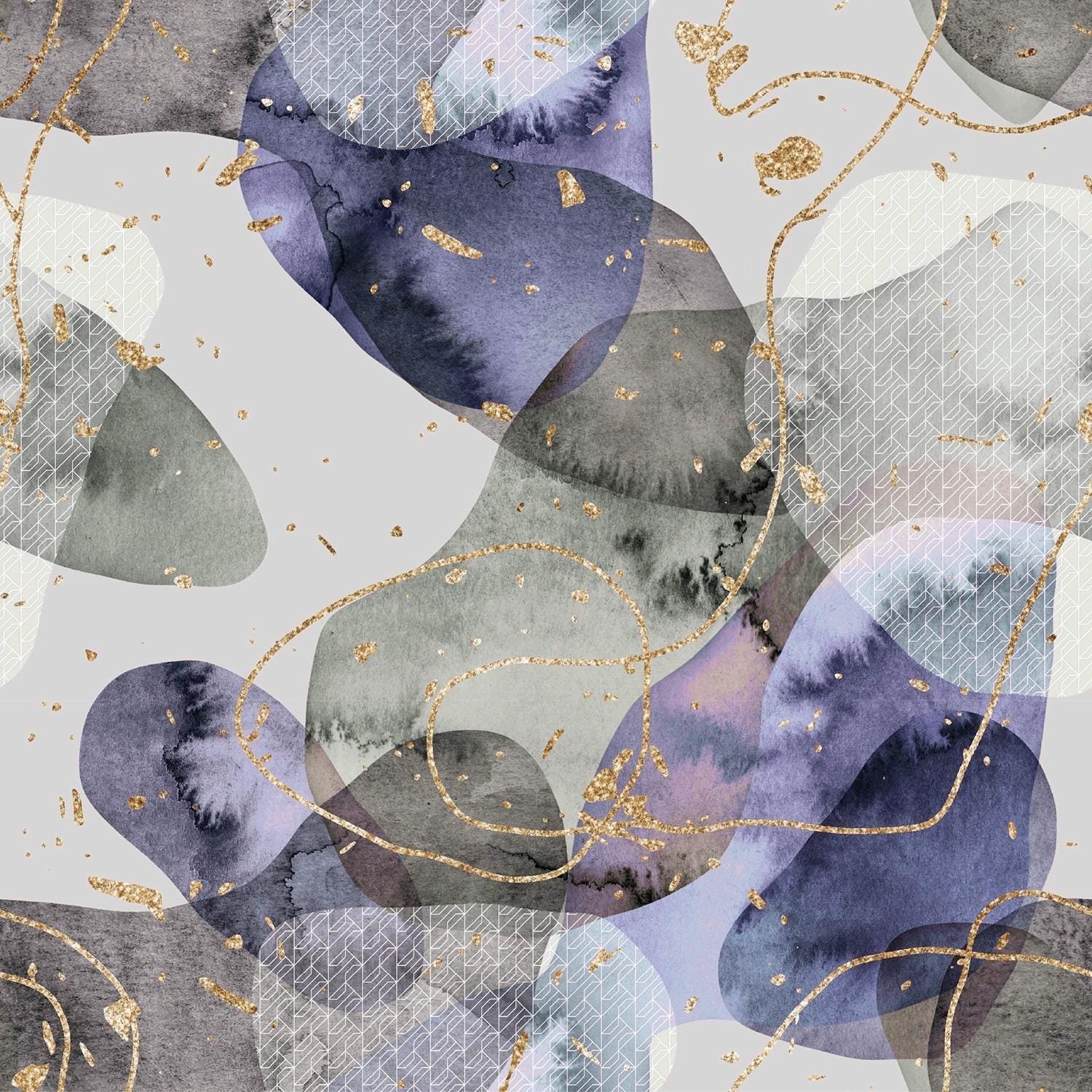 Die Oberfläche ist hell und mit einem abstrakten Muster in hellgrau und violett bedruckt, und mit goldenen Linien und Sprenkeln bedeckt.