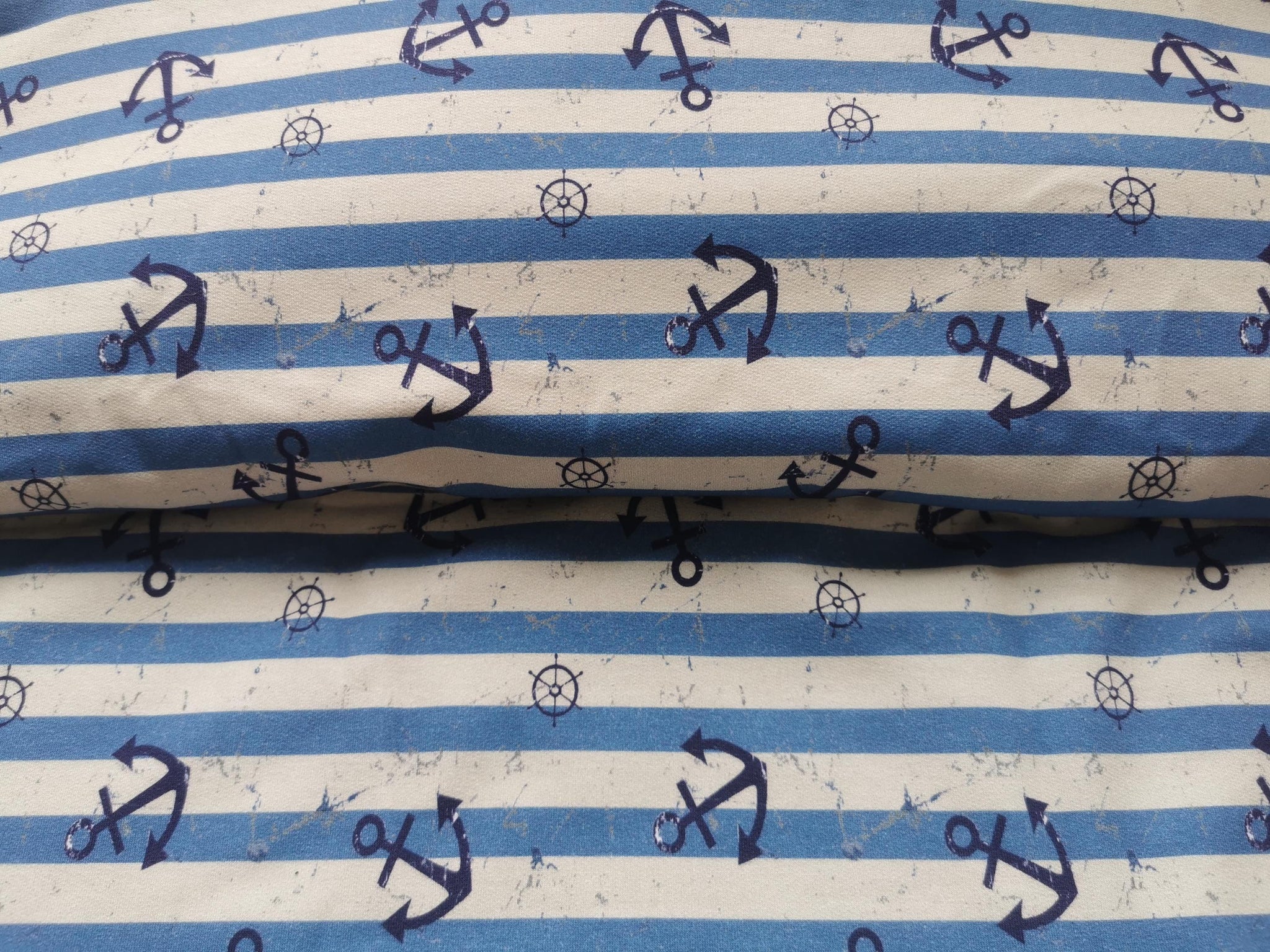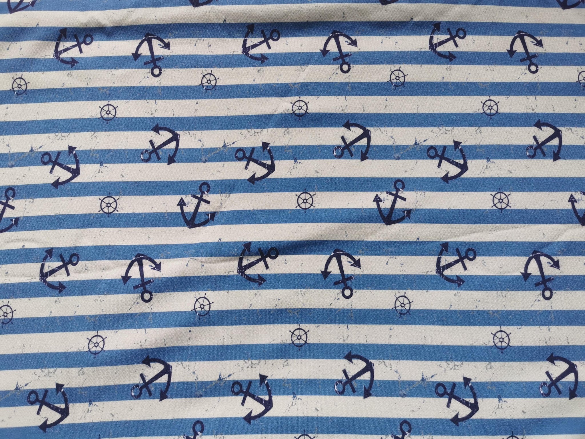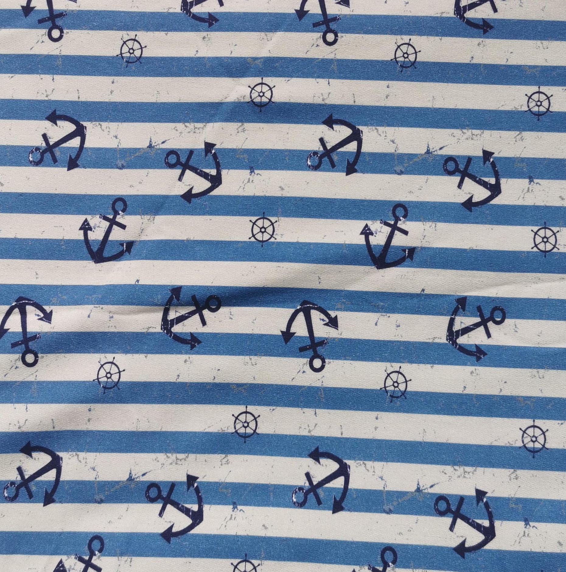 French Terry Stoff Druck Vintage blaue Anker, maritim blau/creme gestreift
