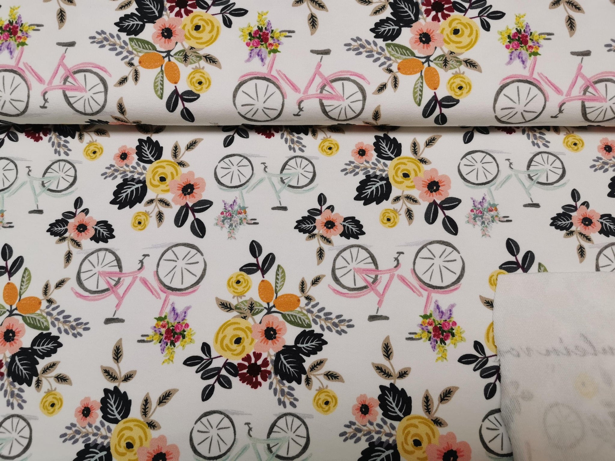French Terry Stoff rosa farbenes Fahrrad und gelbe Blumen, weiß | Fräulein von Julie