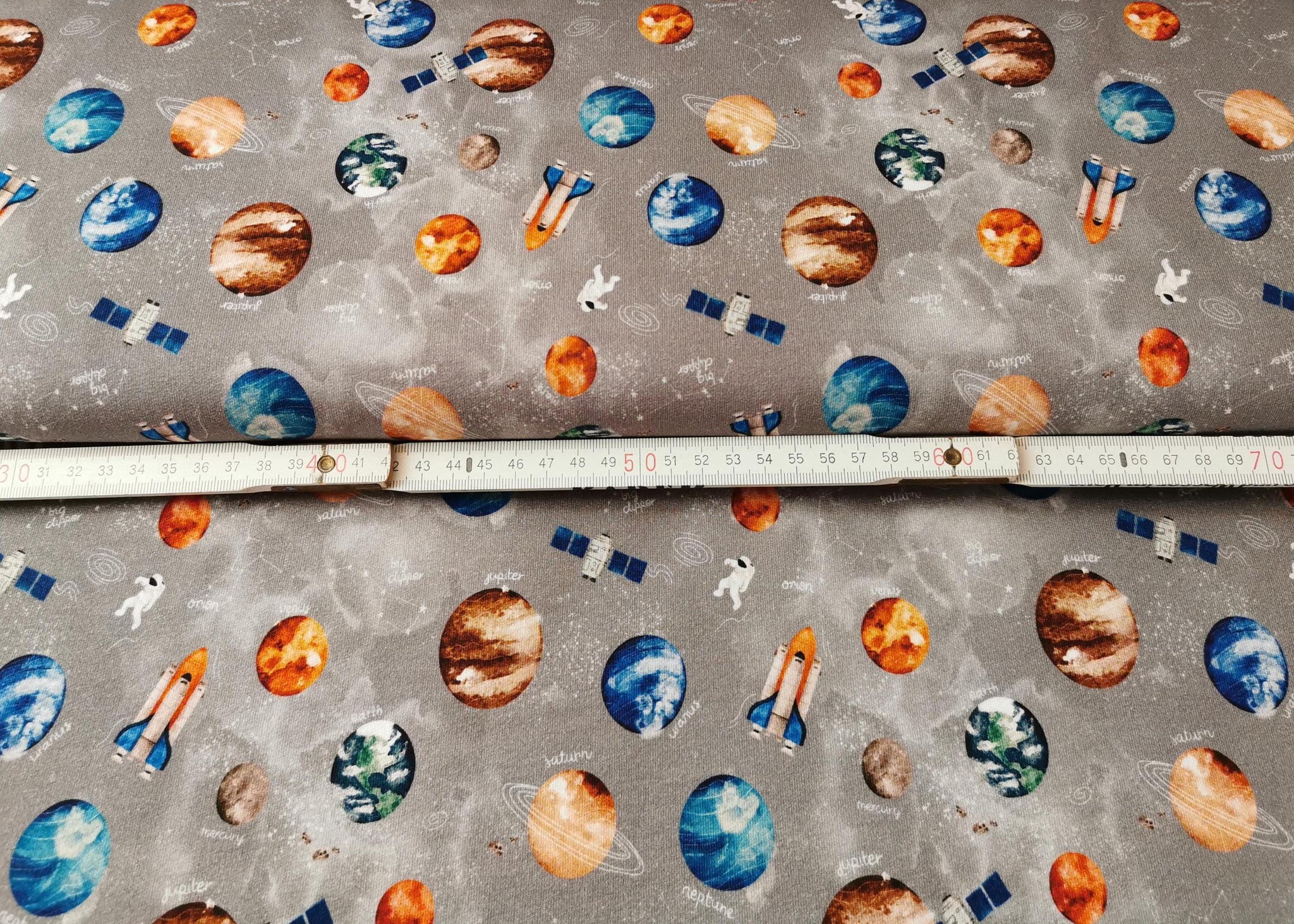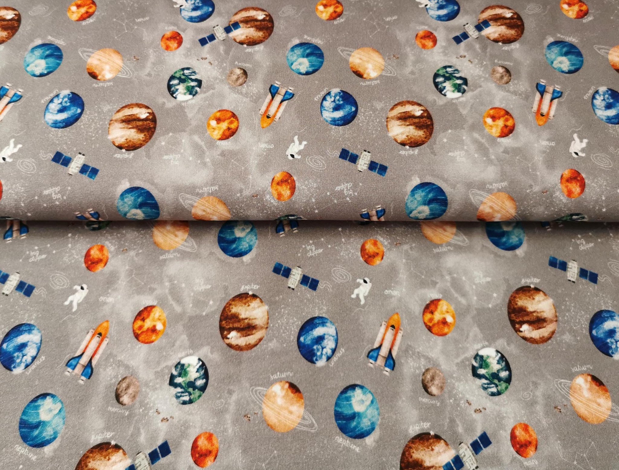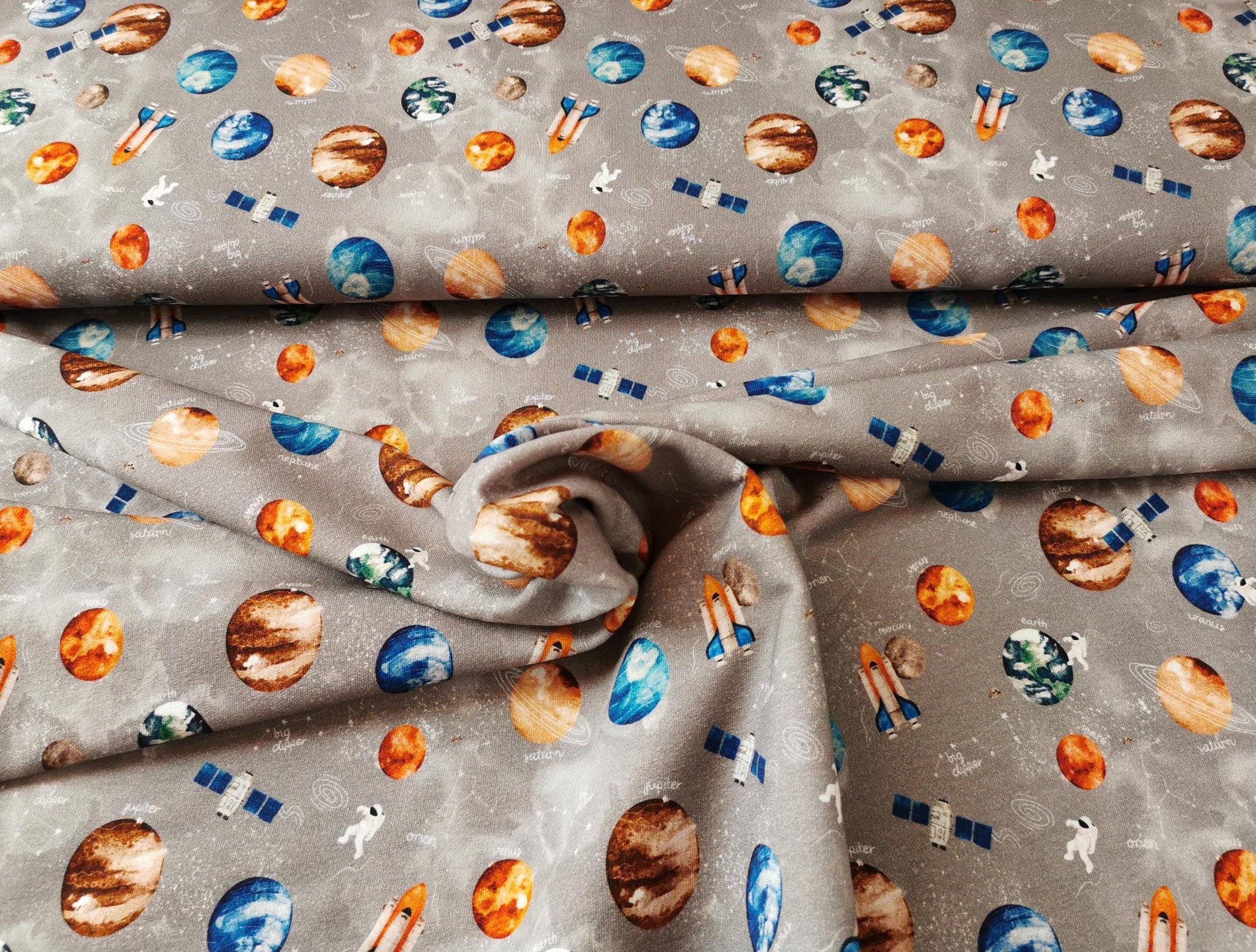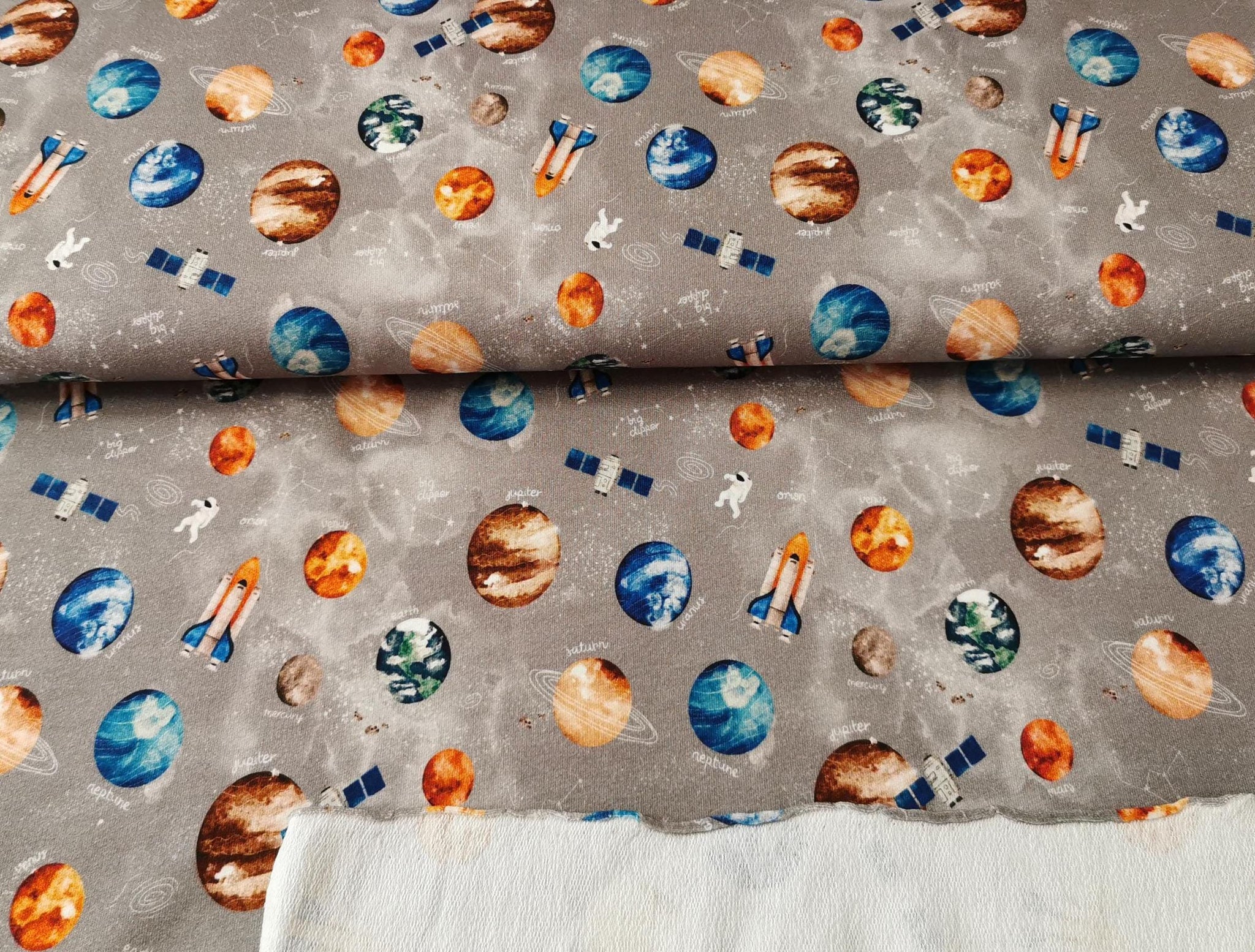 French-Terry Stoff Weltraum mit Raketen, Shuttles, Satelliten und Planeten auf grau | designed by POPPY Europe