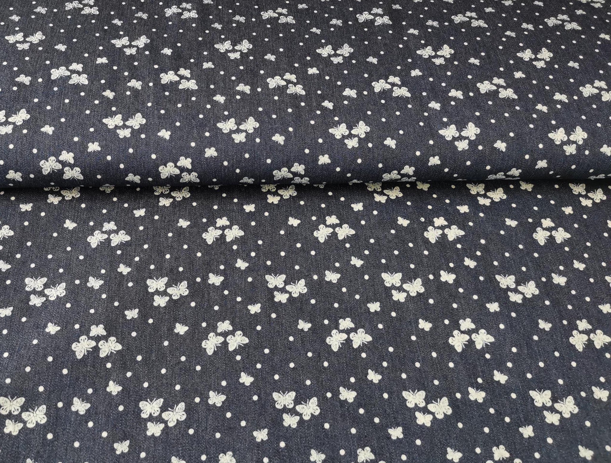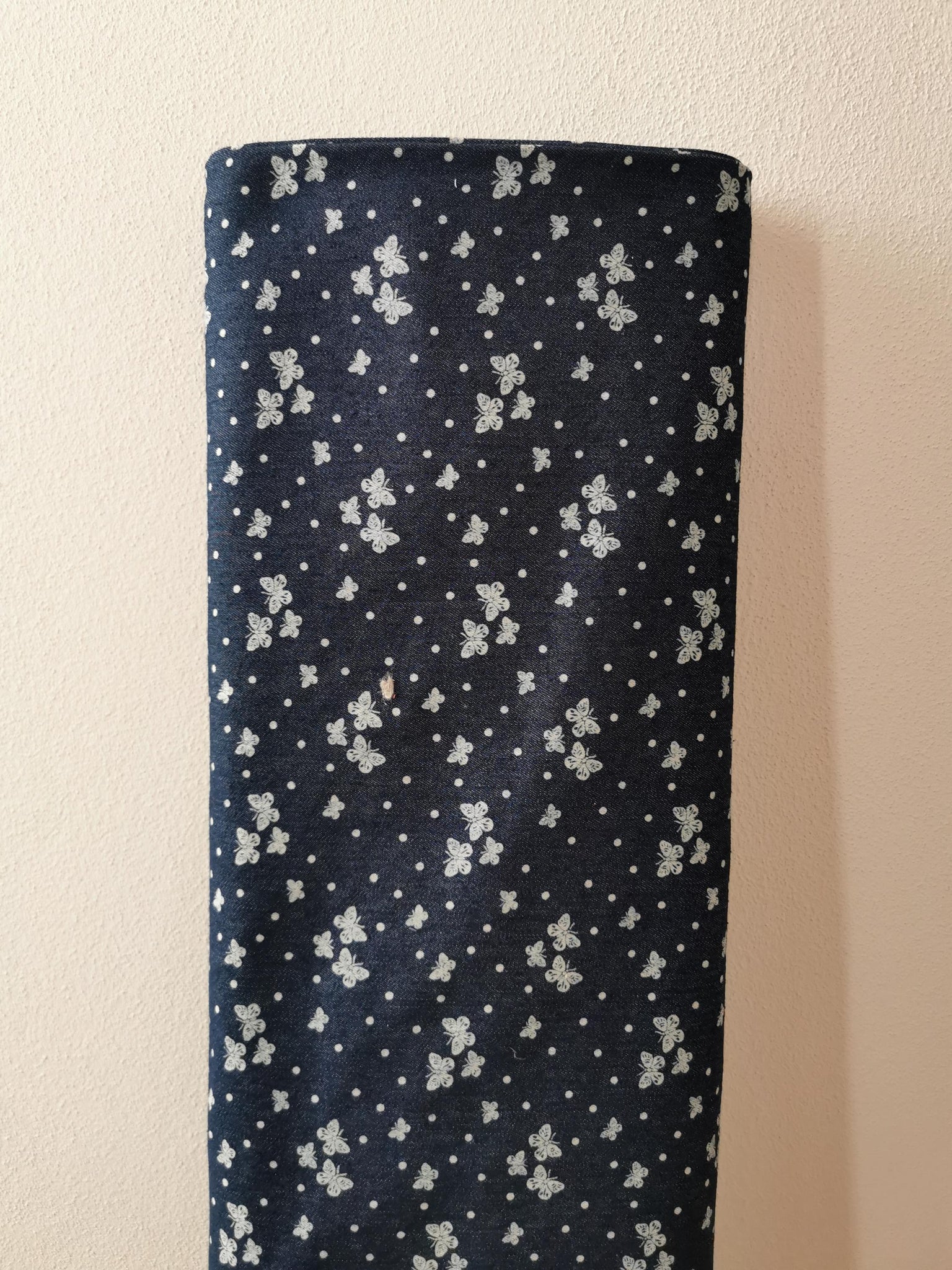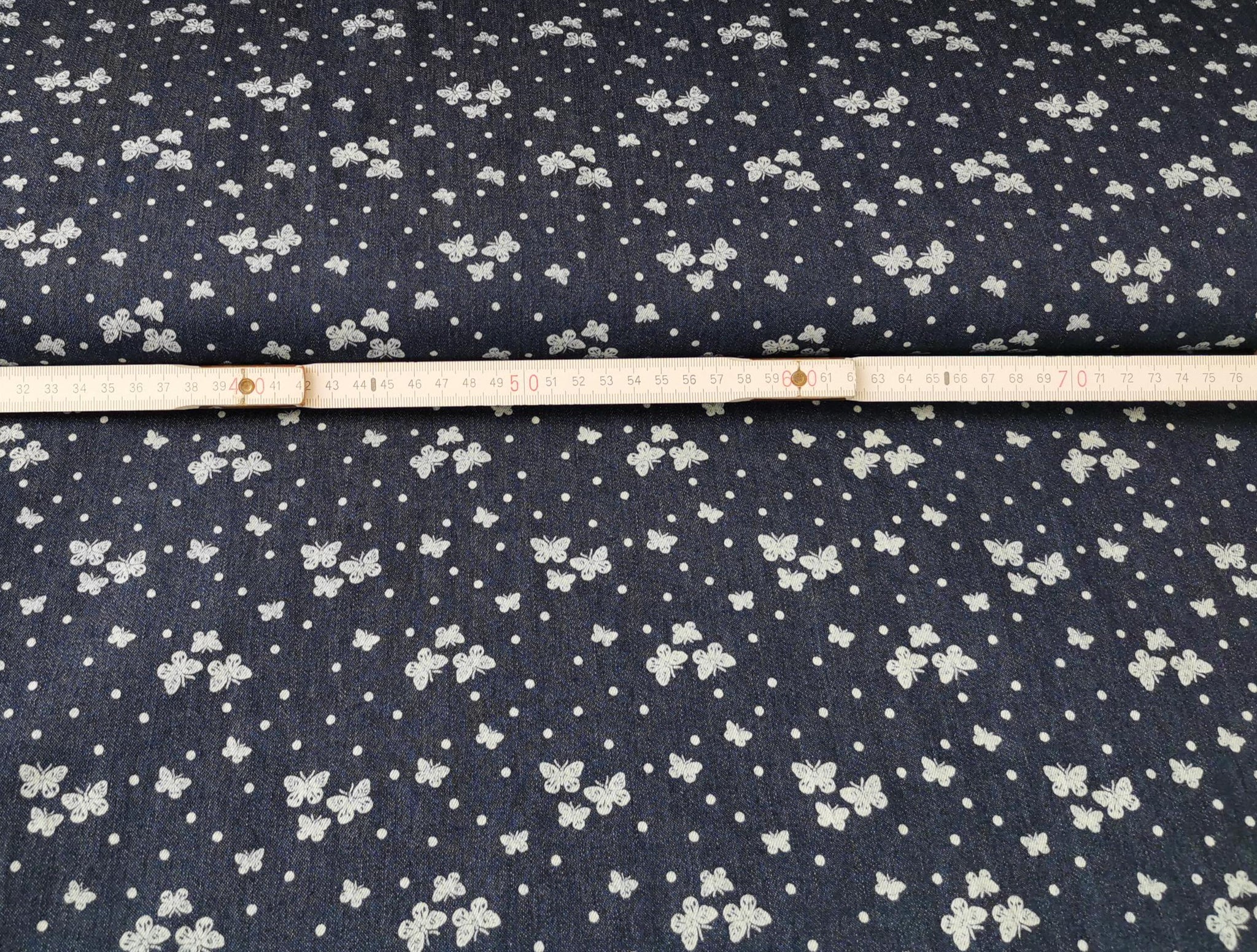 Jeansstoff dunkelblau mit kleinen hellblauen Schmetterlingen
