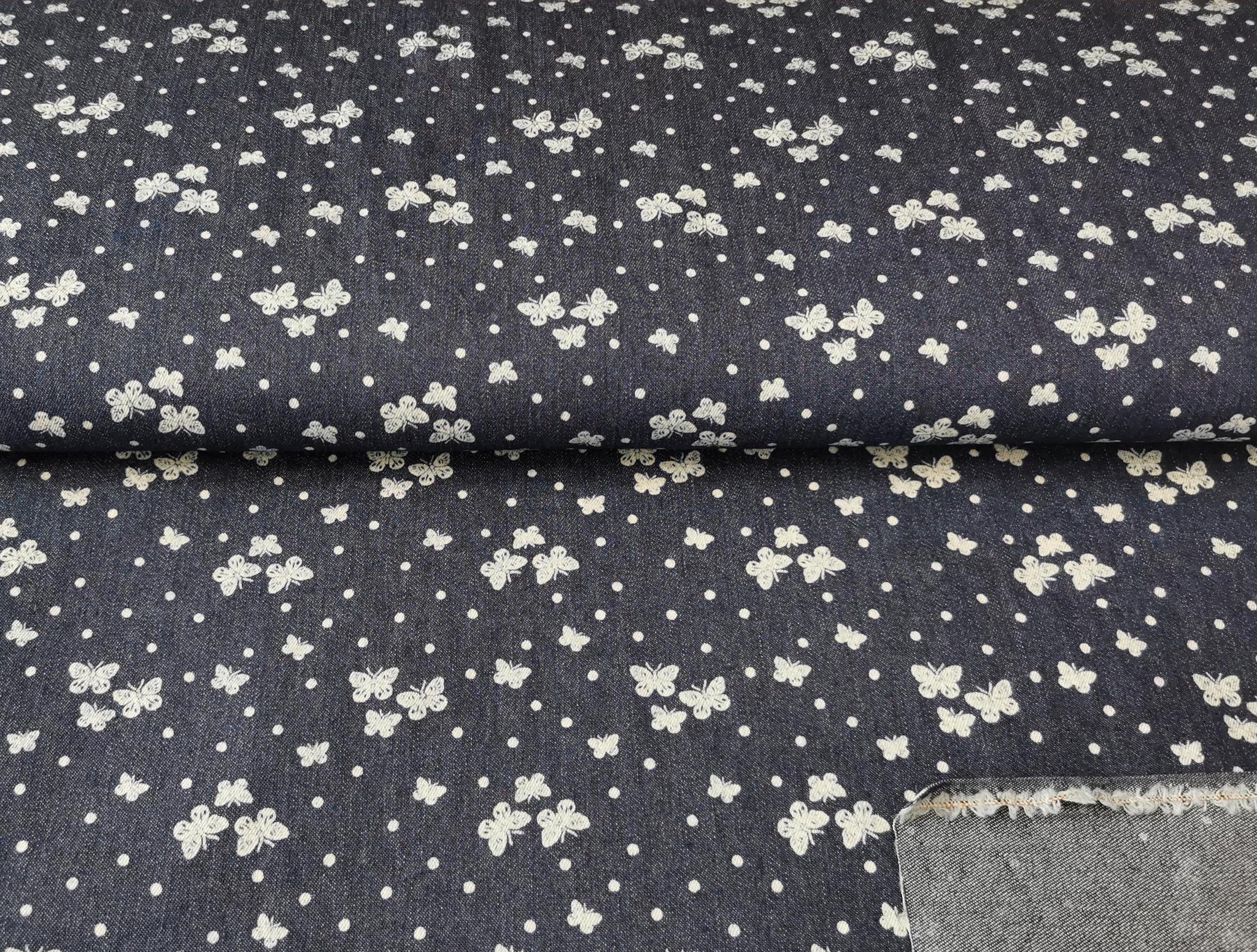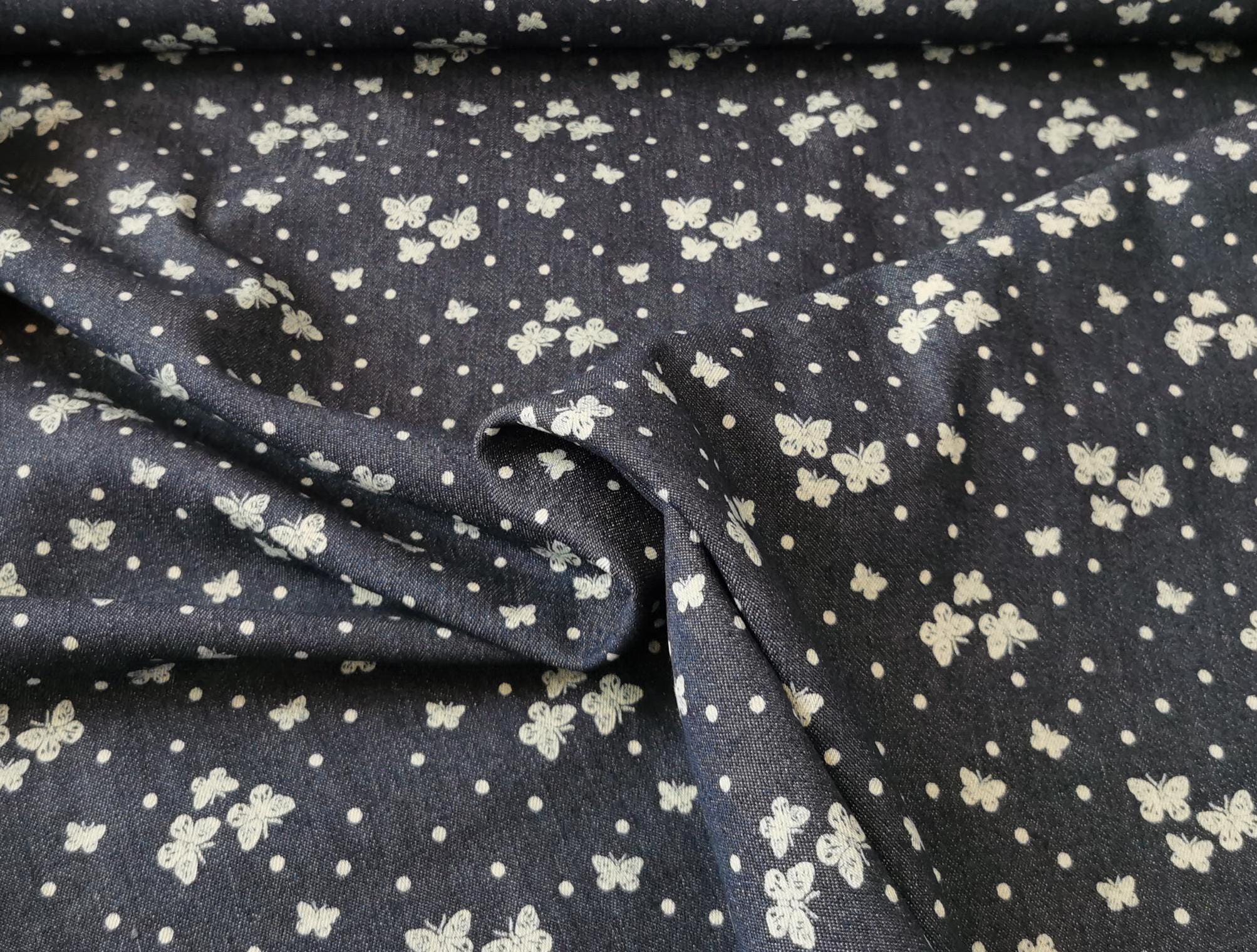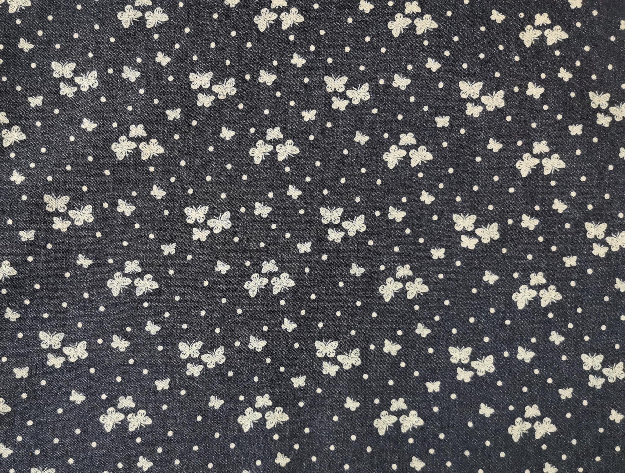 Jeansstoff dunkelblau mit kleinen hellblauen Schmetterlingen