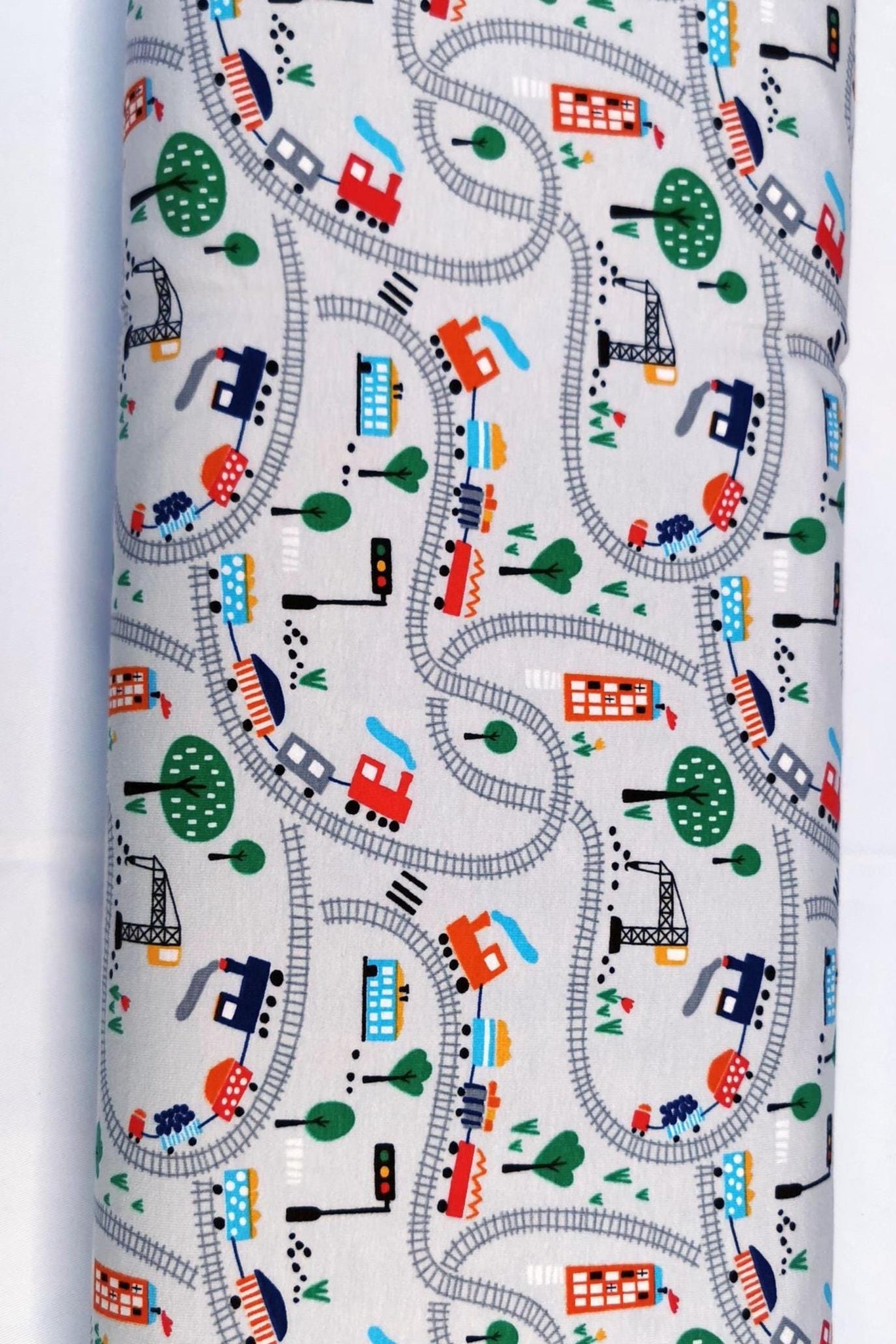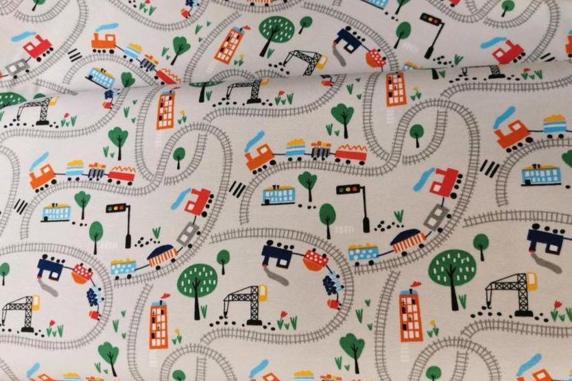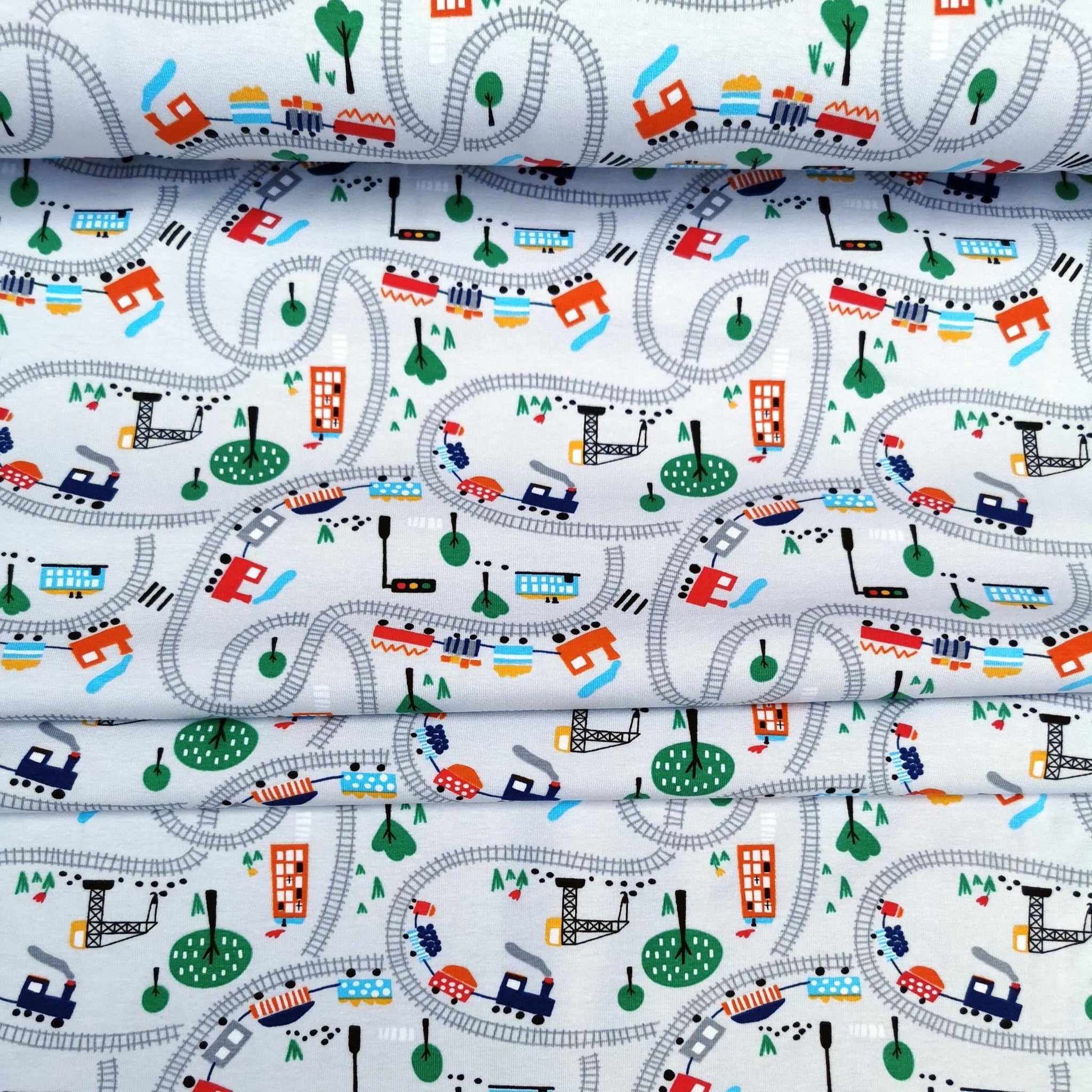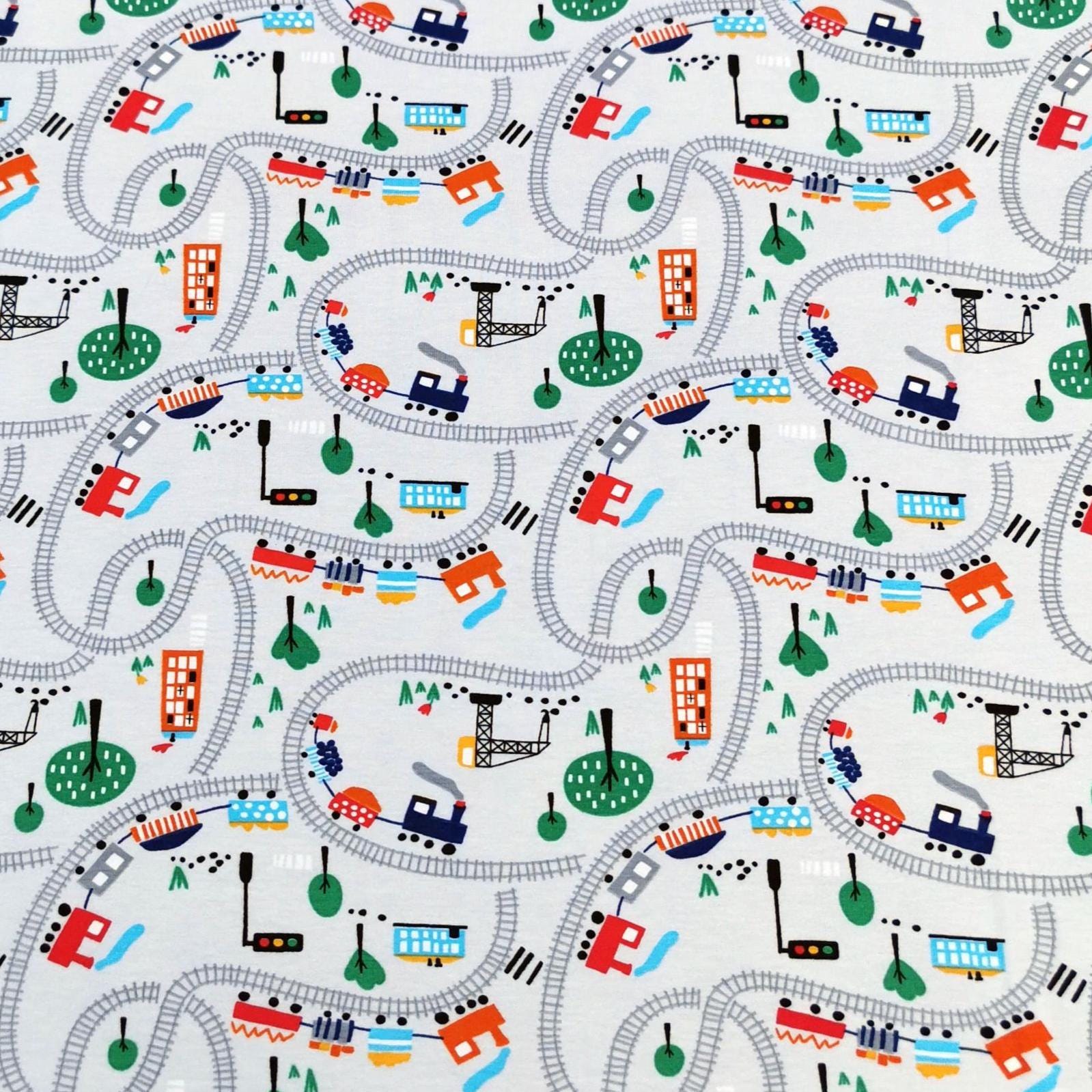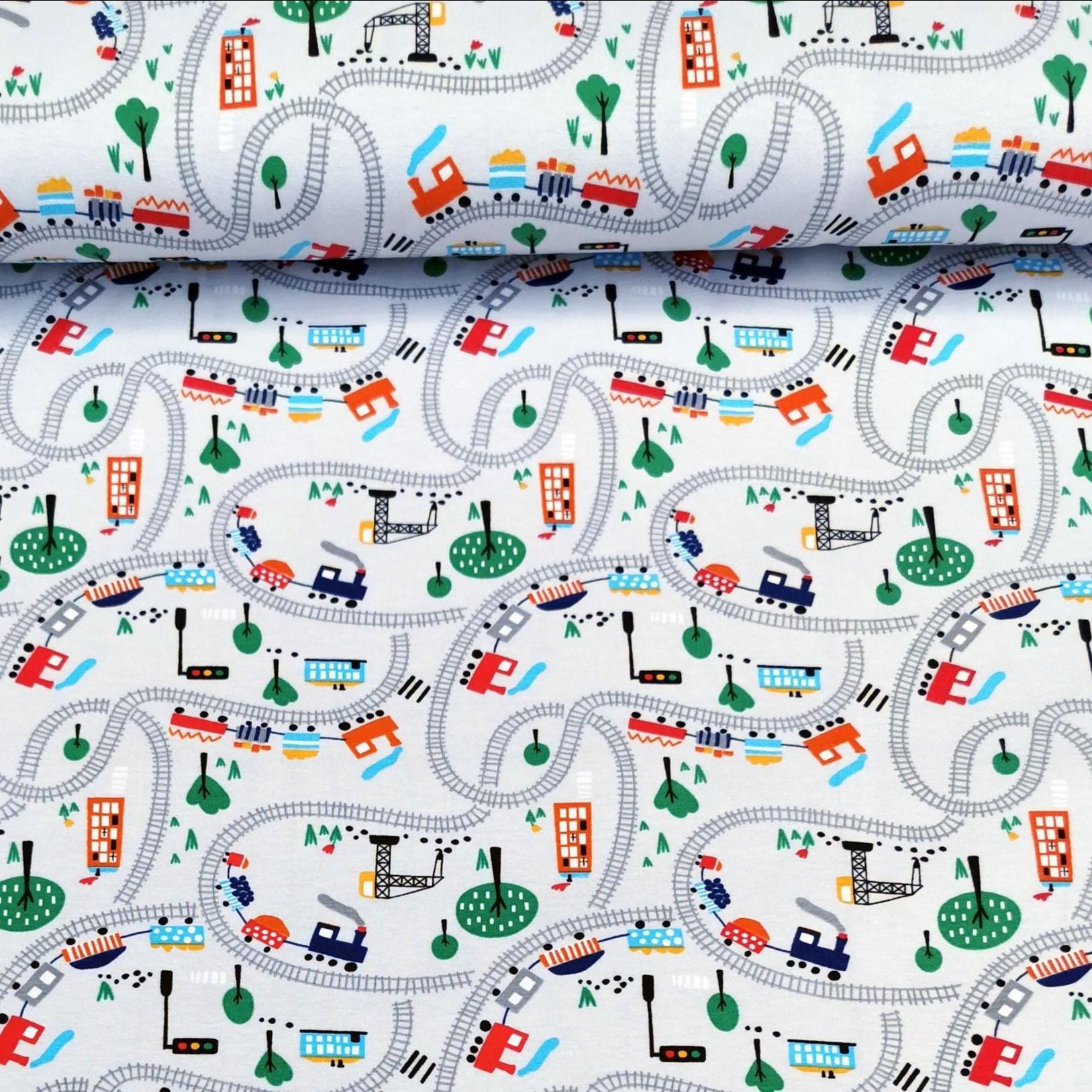 Jersey Stoff "Eisenbahn" rote und schwarze Dampfzüge auf Schienen