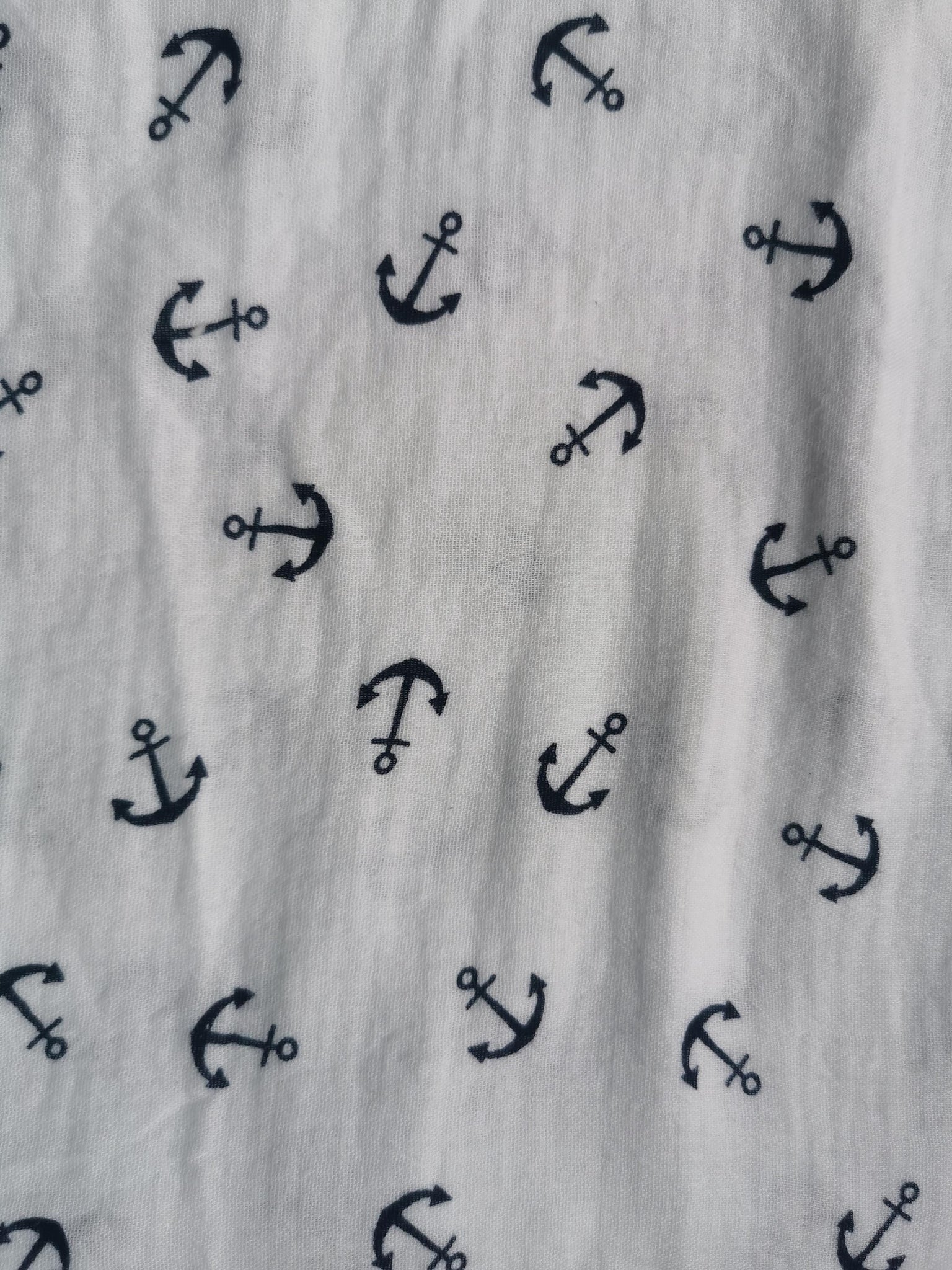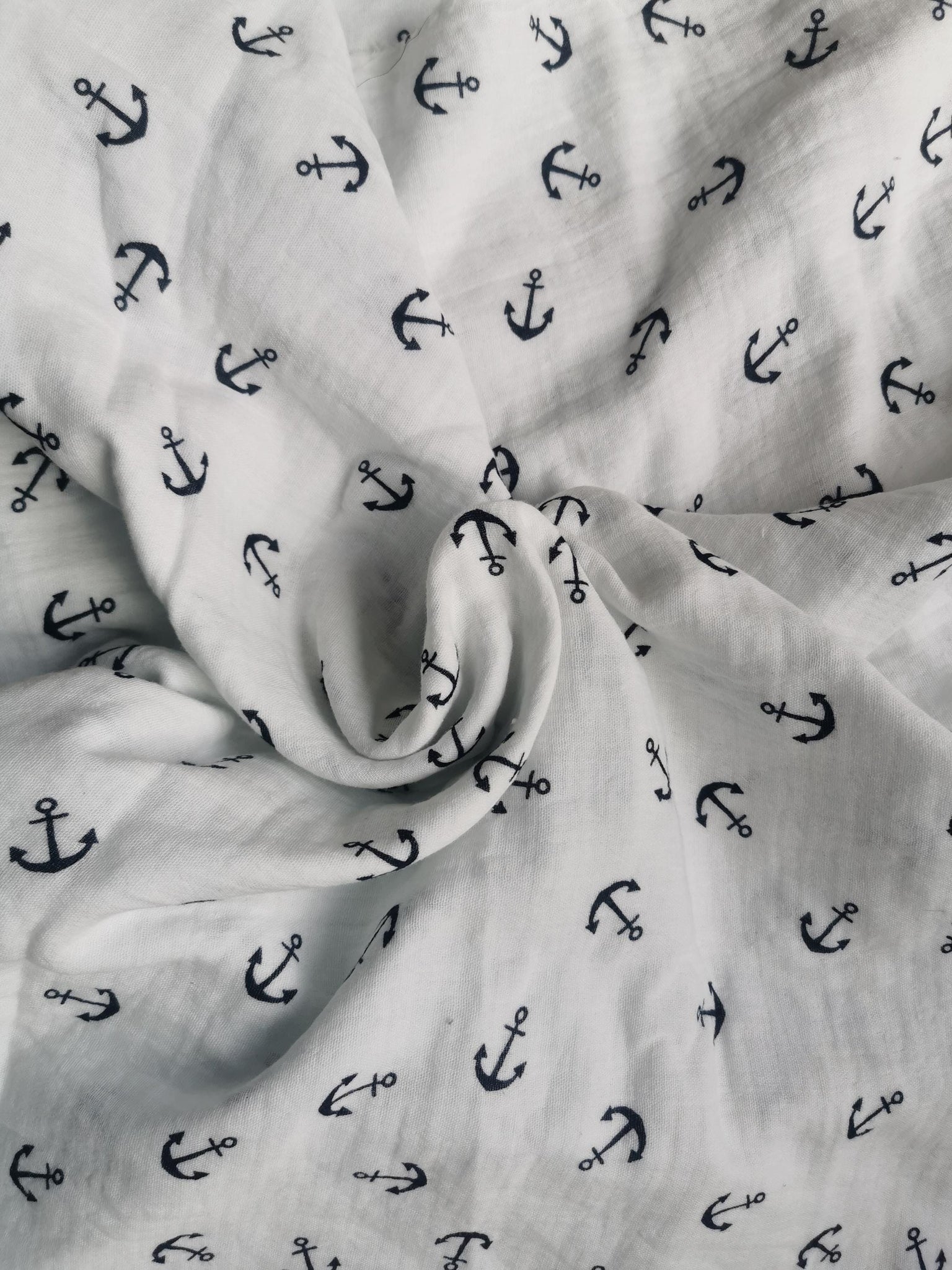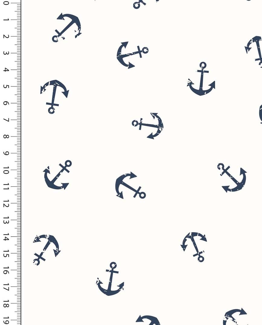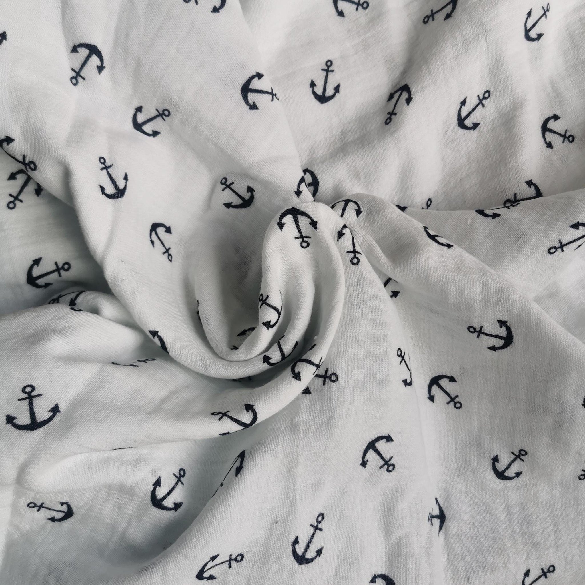 maritimer Musselin Stoff natur mit blauen Ankern - Urlaub am Meer - 100% Baumwolle