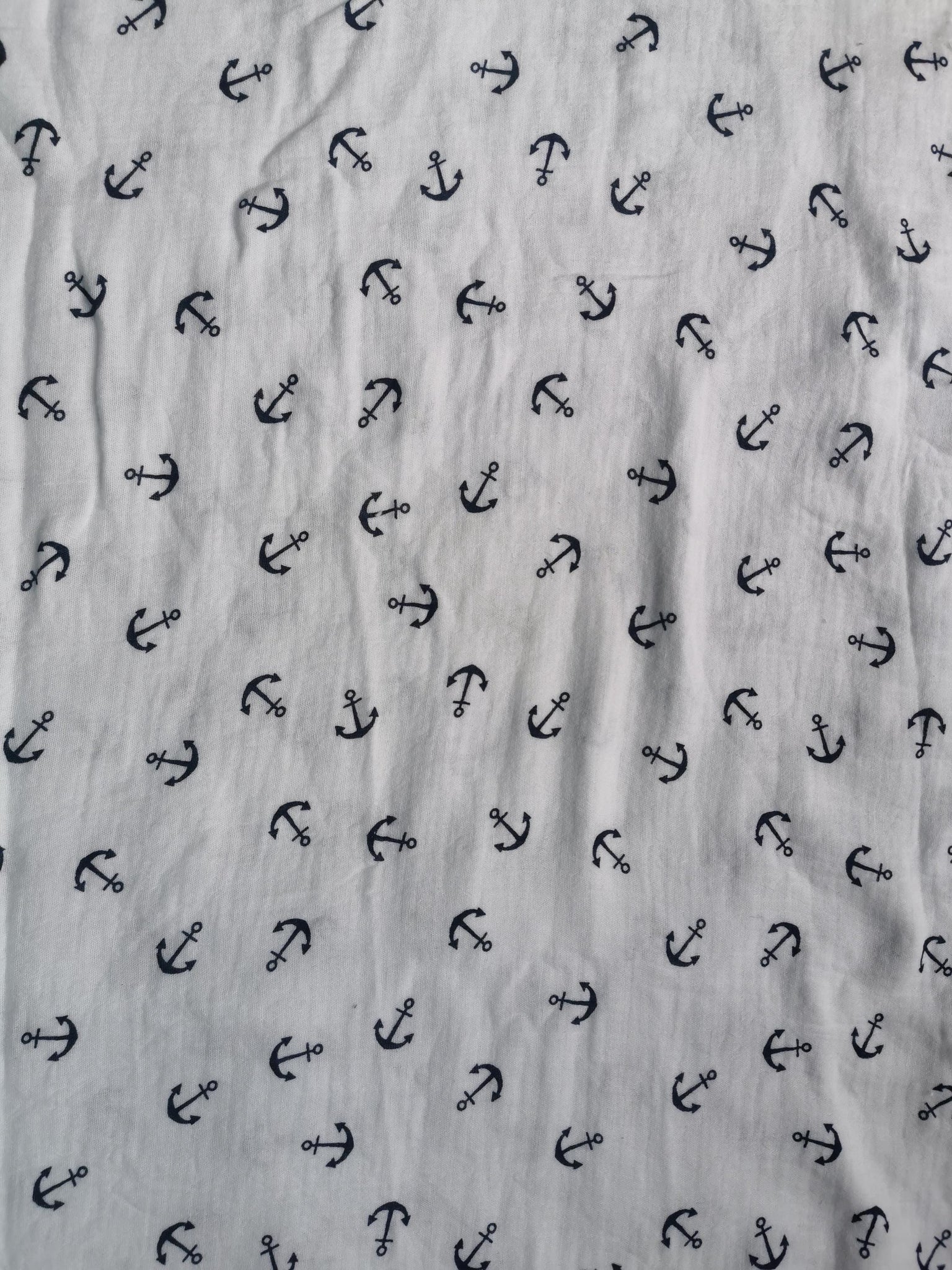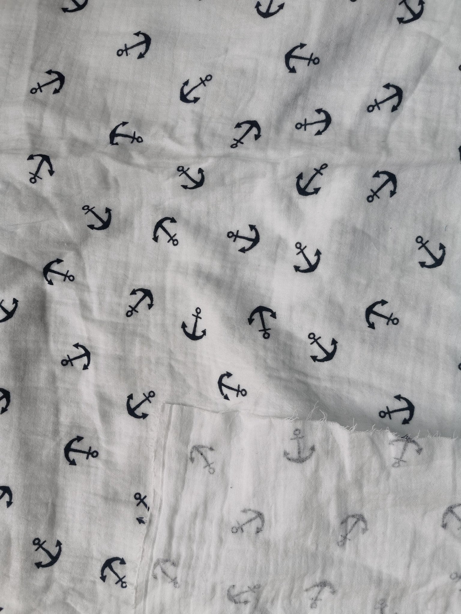 Reststück: maritimer Musselin Stoff natur mit blauen Ankern - Urlaub am Meer - 100% Baumwolle; ca. 1,0m
