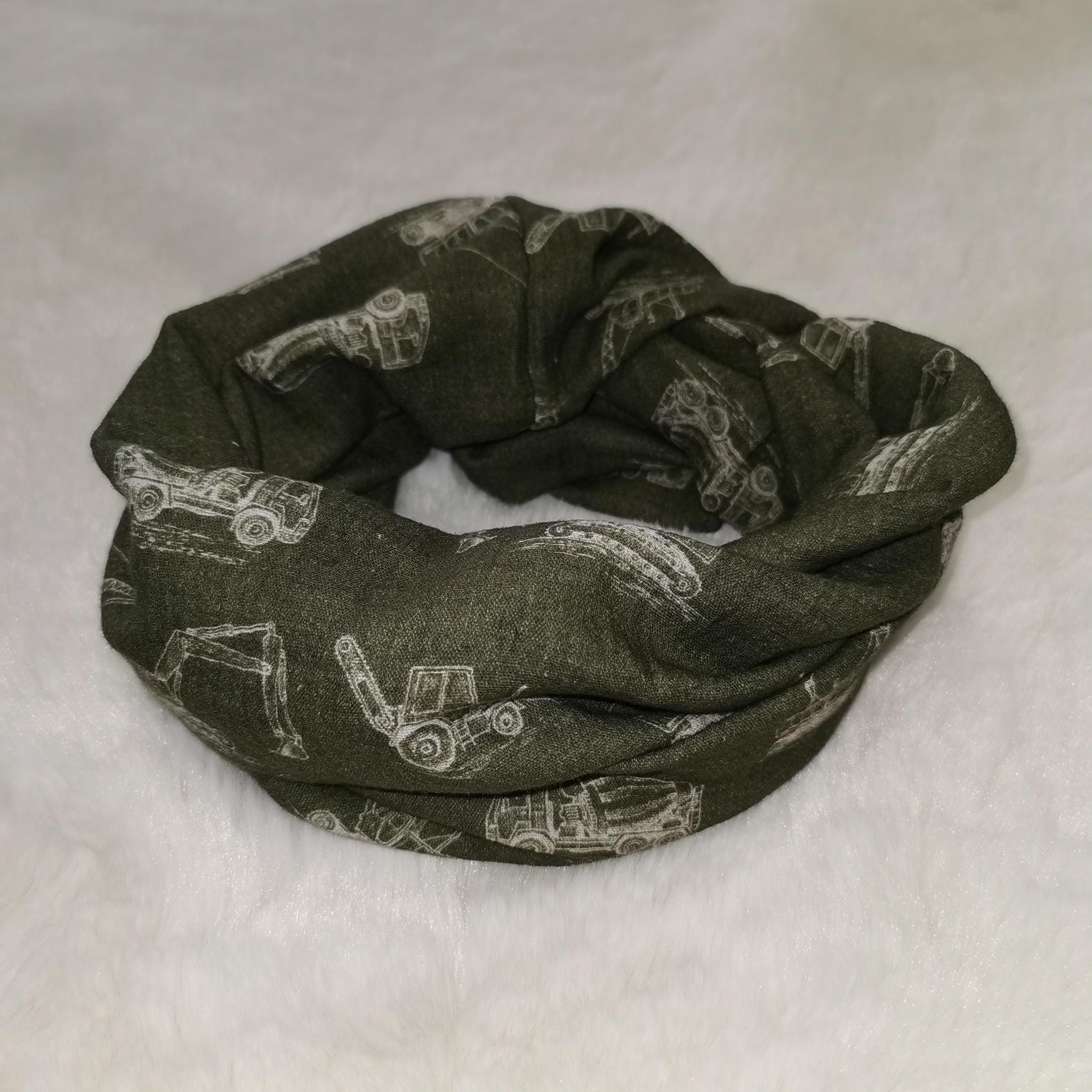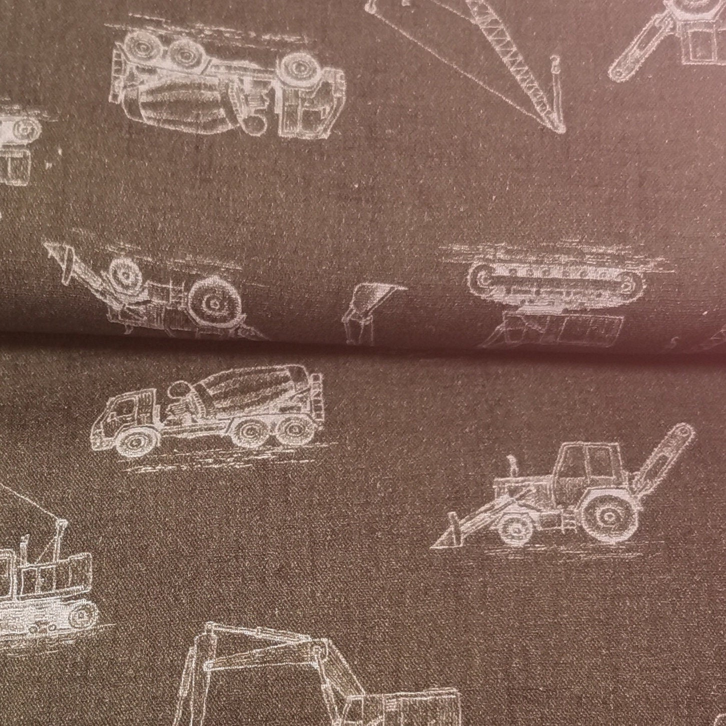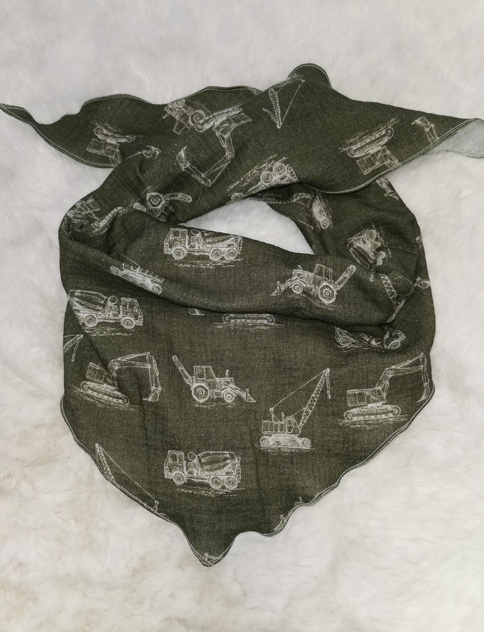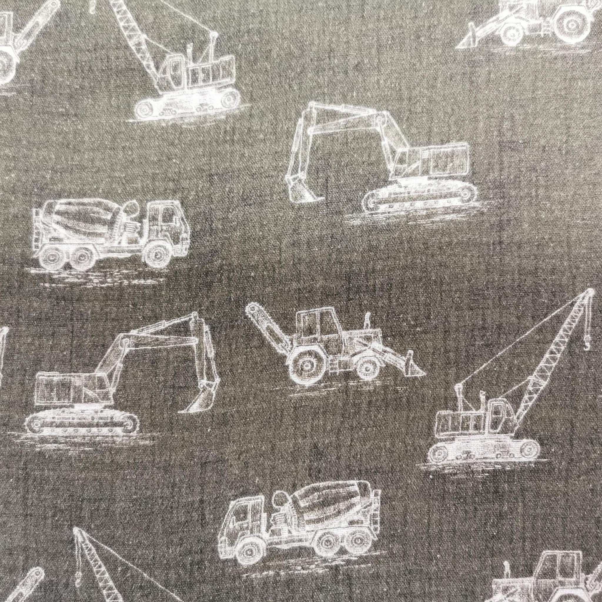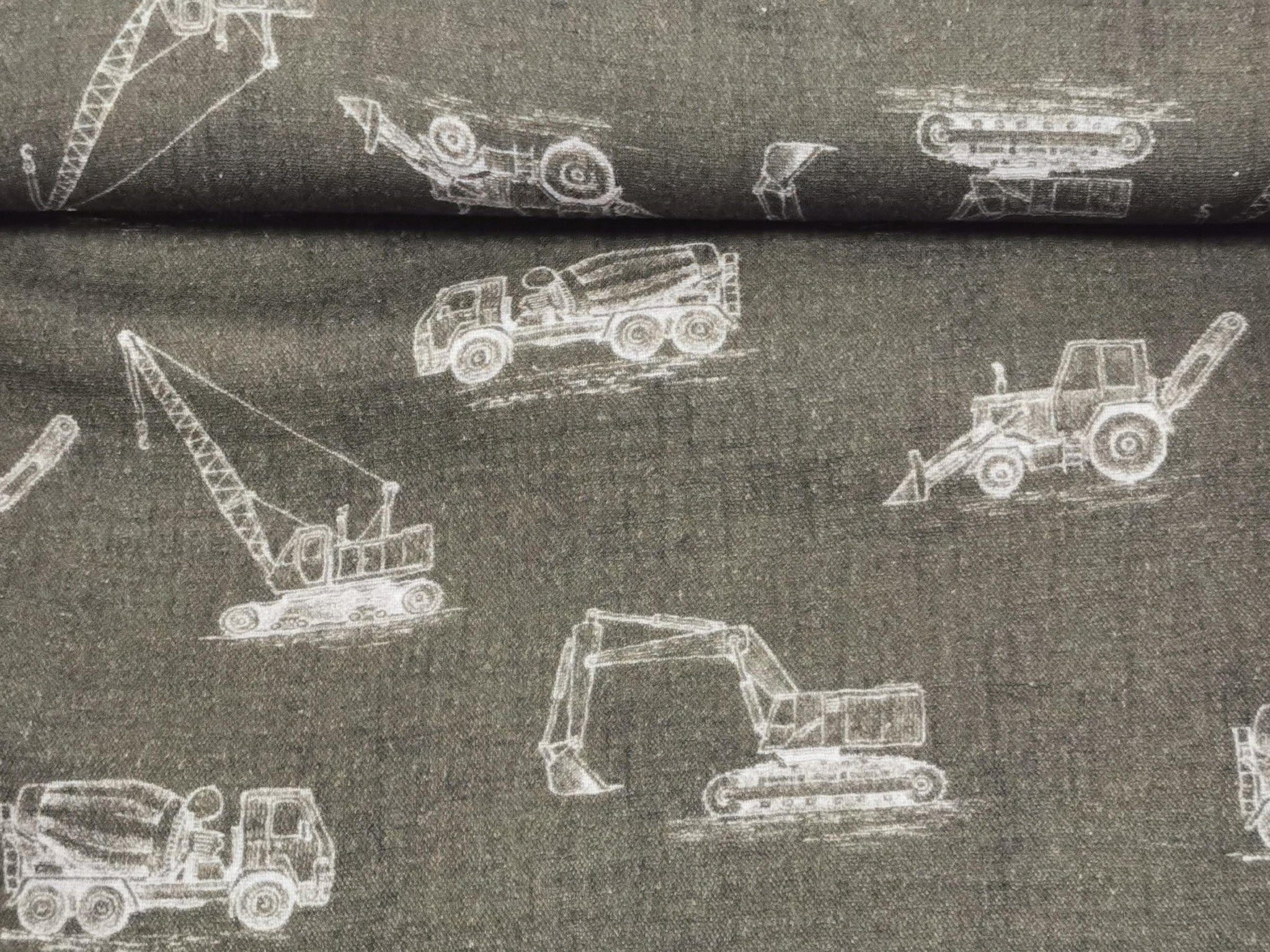 Musselin Druck "Jörn" weiße Baustellenfahrzeuge auf olivgrün