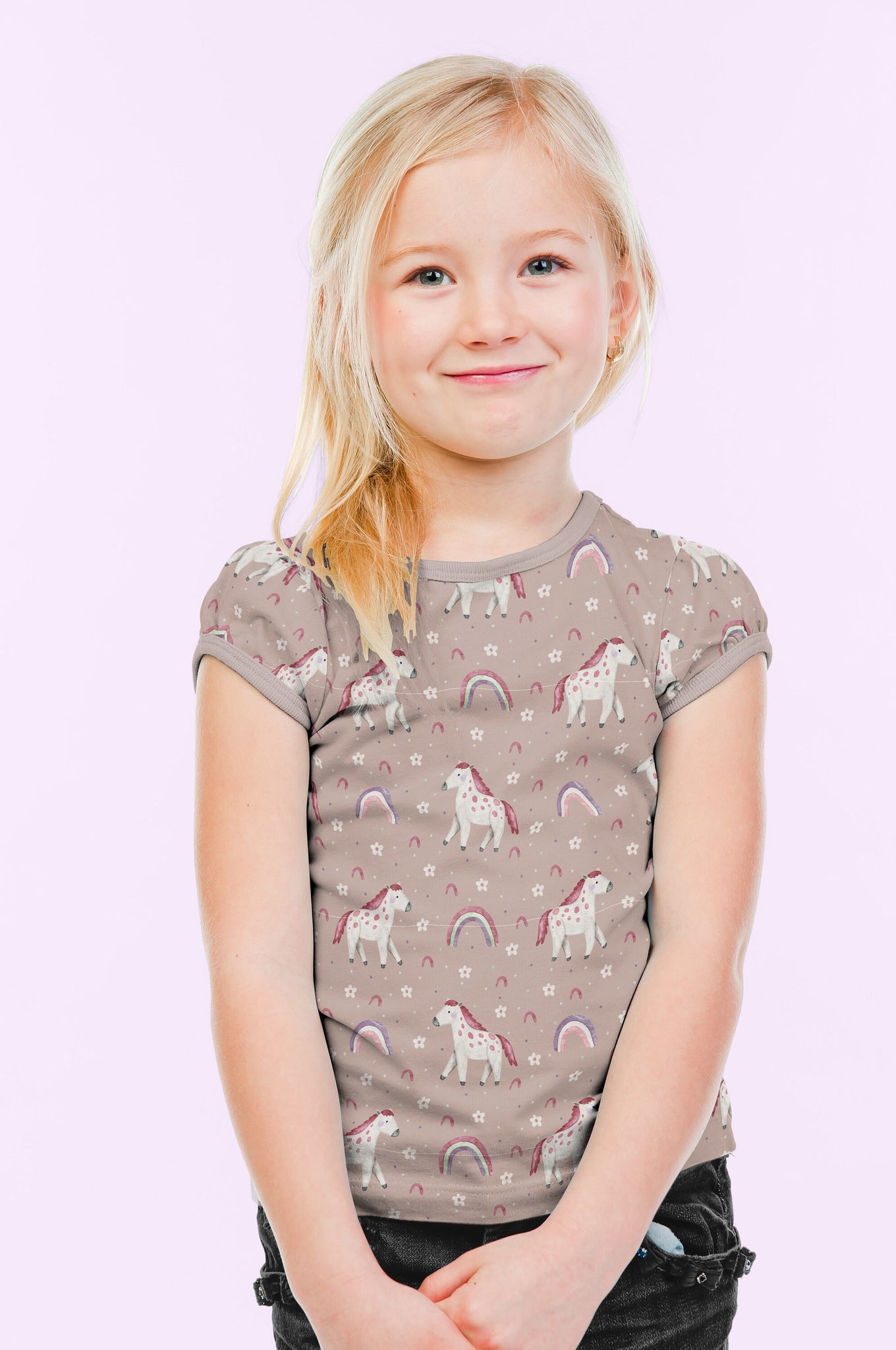 Die Oberfläche ist mit Pferden, Regenbogen und Blümchen auf altrosafarbenem Hintergrund bedruckt.
