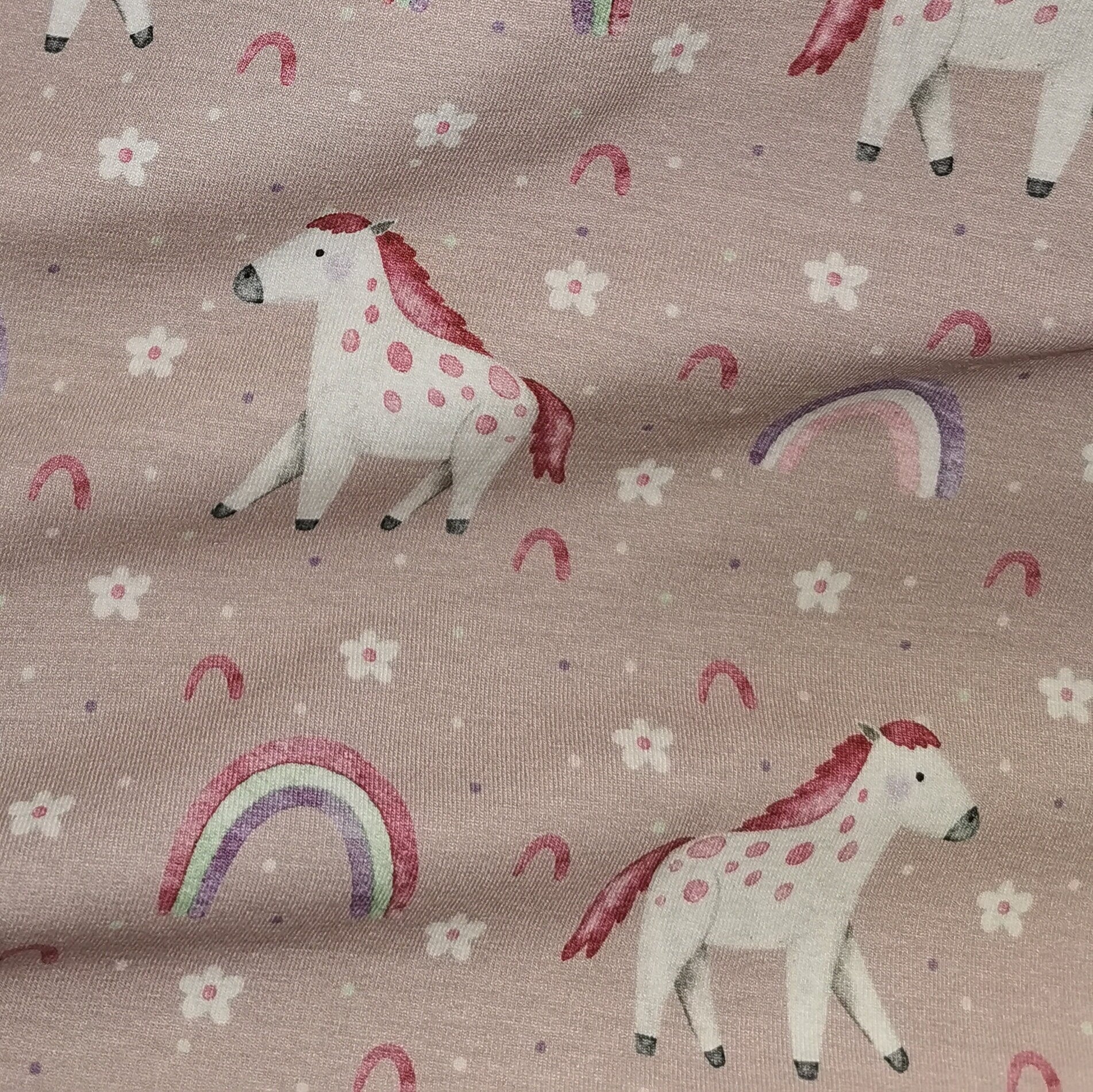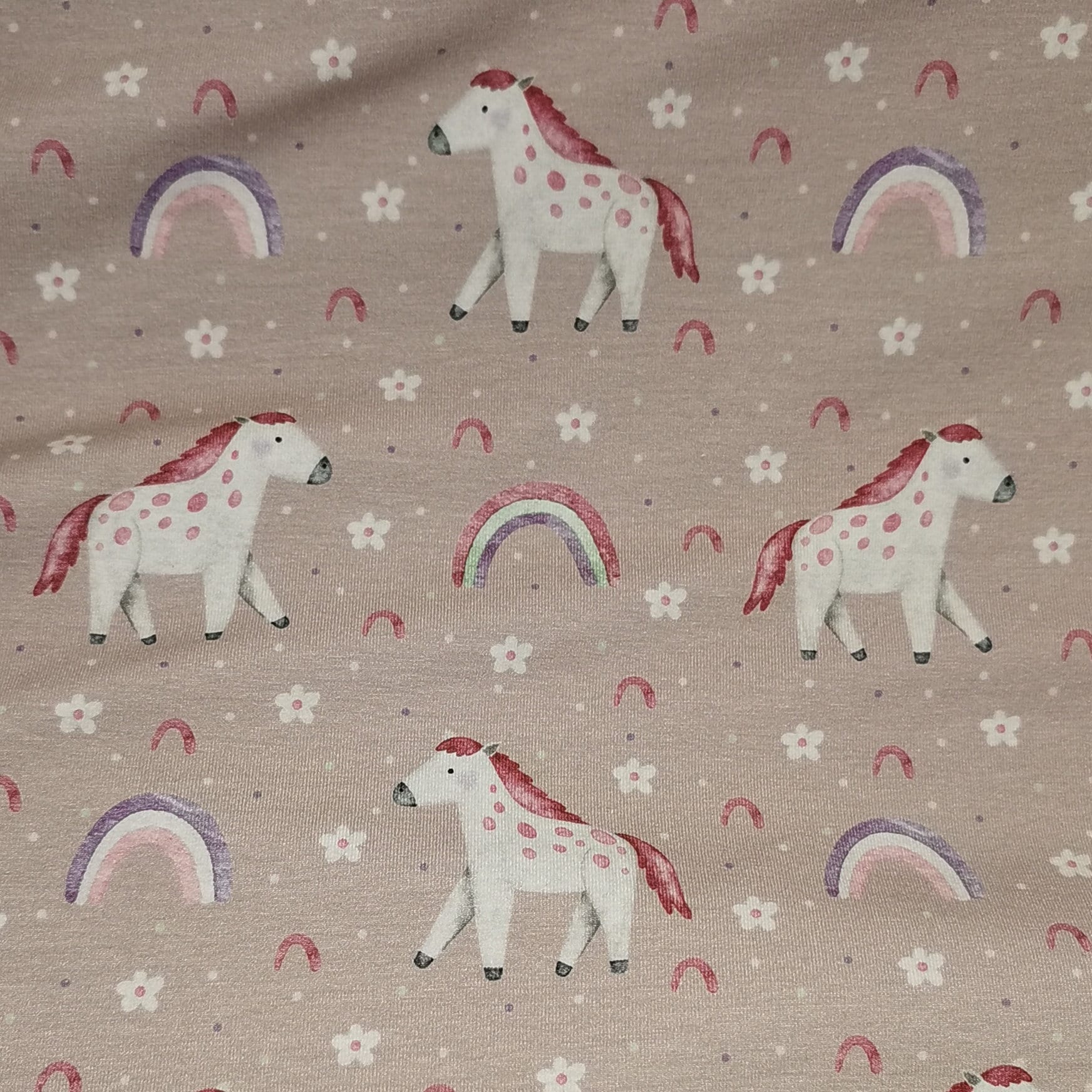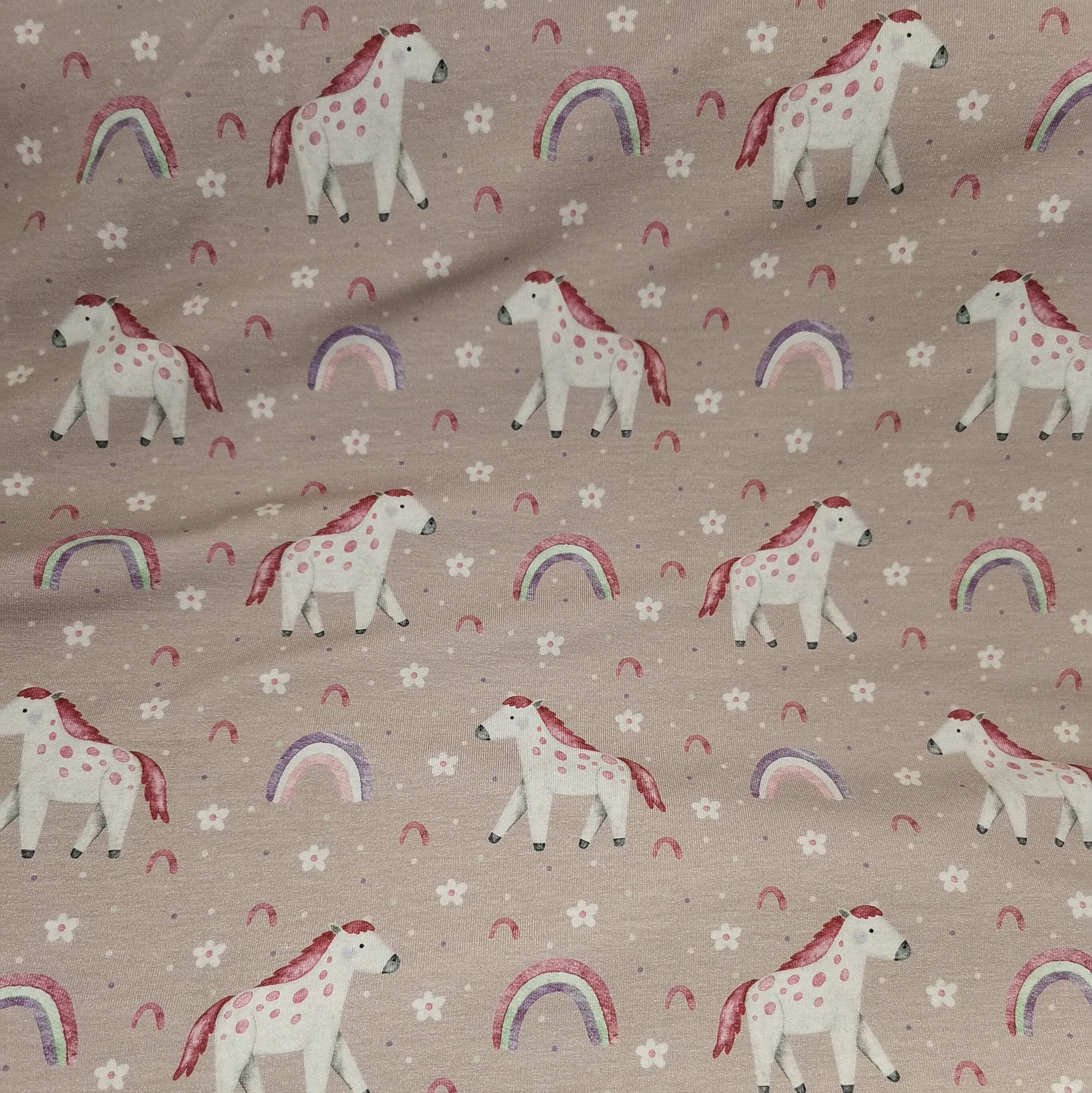 Reststück: Baumwolljersey Druck "Manuel" Pferd mit Regenbogen, Blumen auf altrosafarbenem Hintergrund; ca. 0,5m