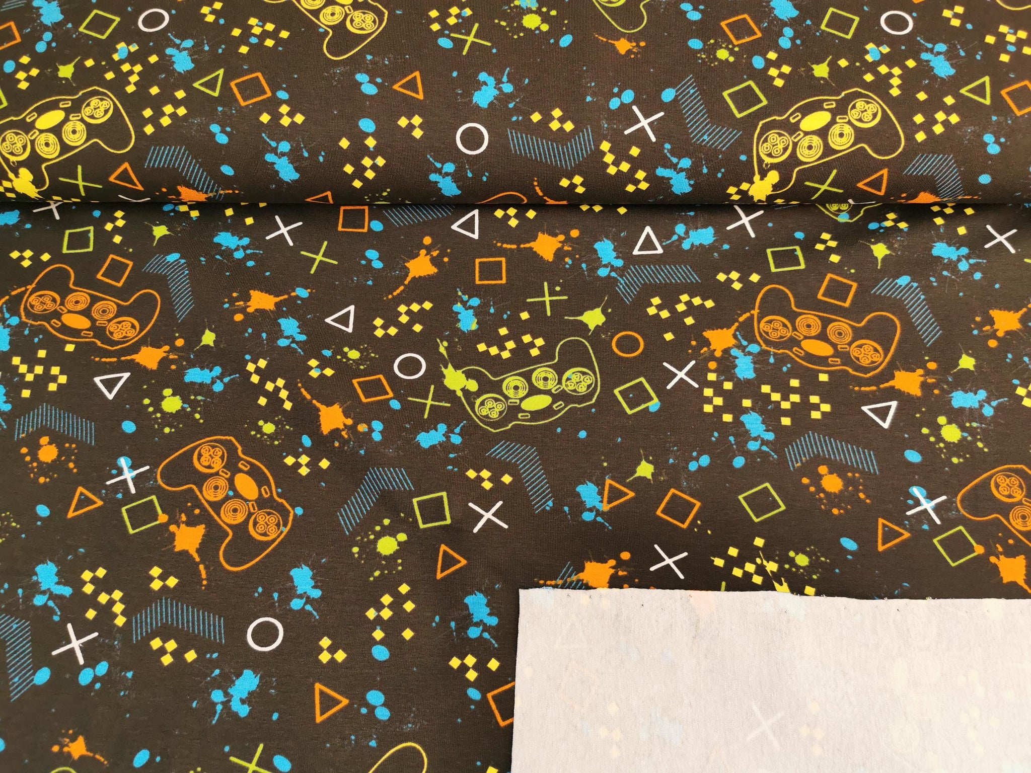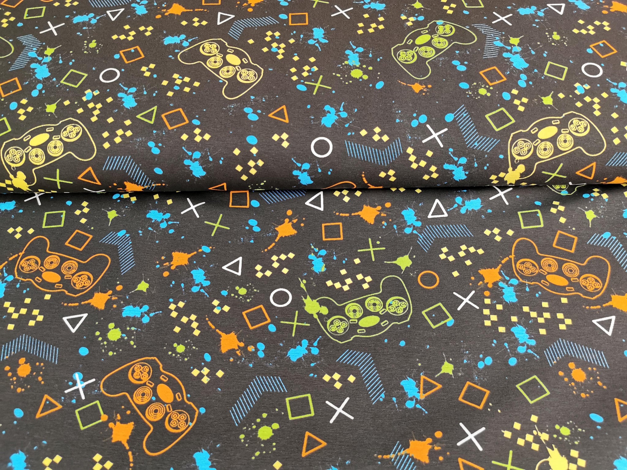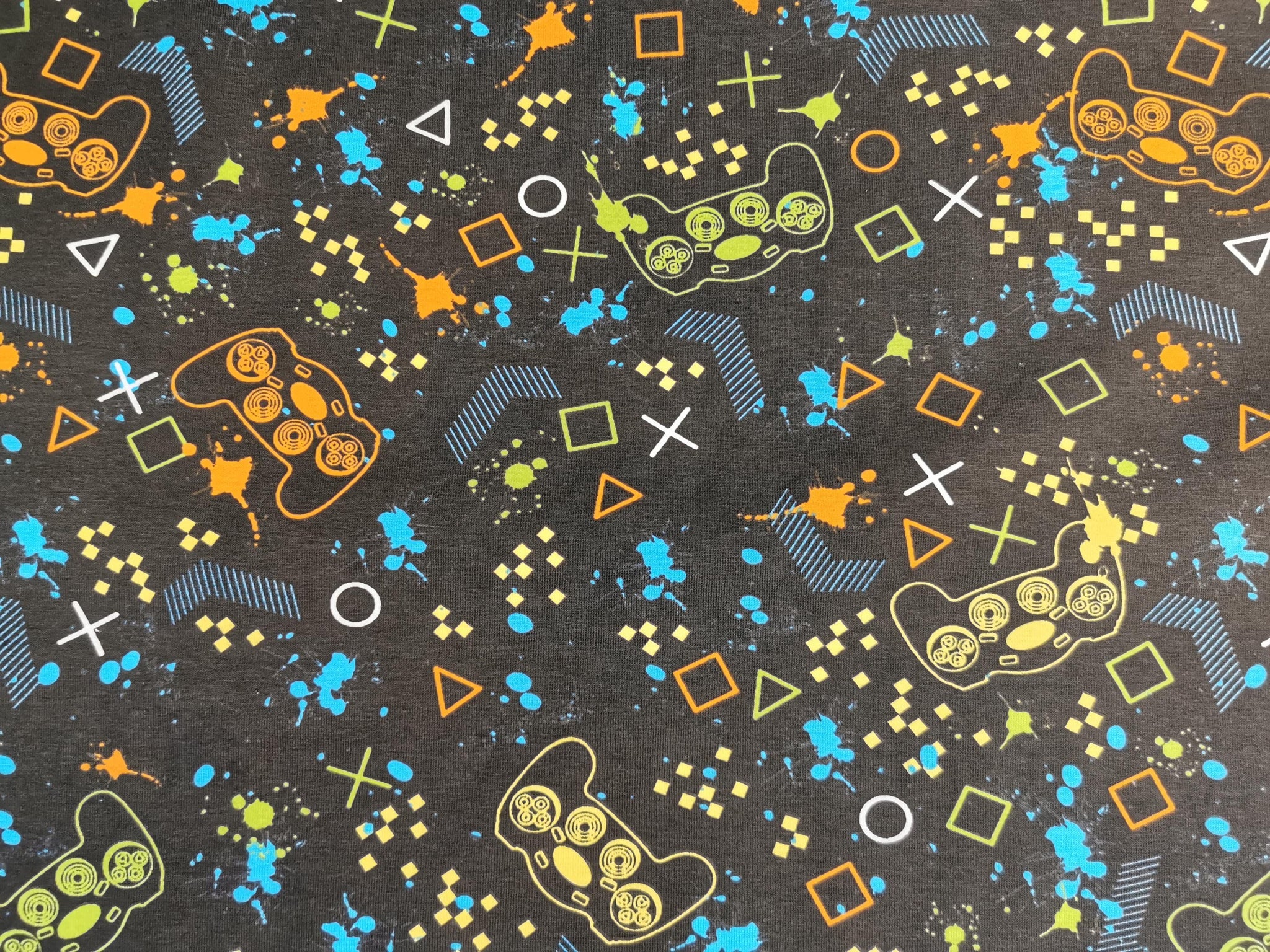Reststück: Baumwolljersey Stoff Controller, Gamer, zocken schwarz neon | Julie Kids Fashion; ca. 1,4m