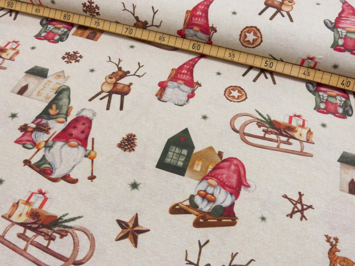 Reststück: Deko Stoff Druck Weihnachten Wichtel Schlitten Häuser Sterne Rehe; ca. 0,5m