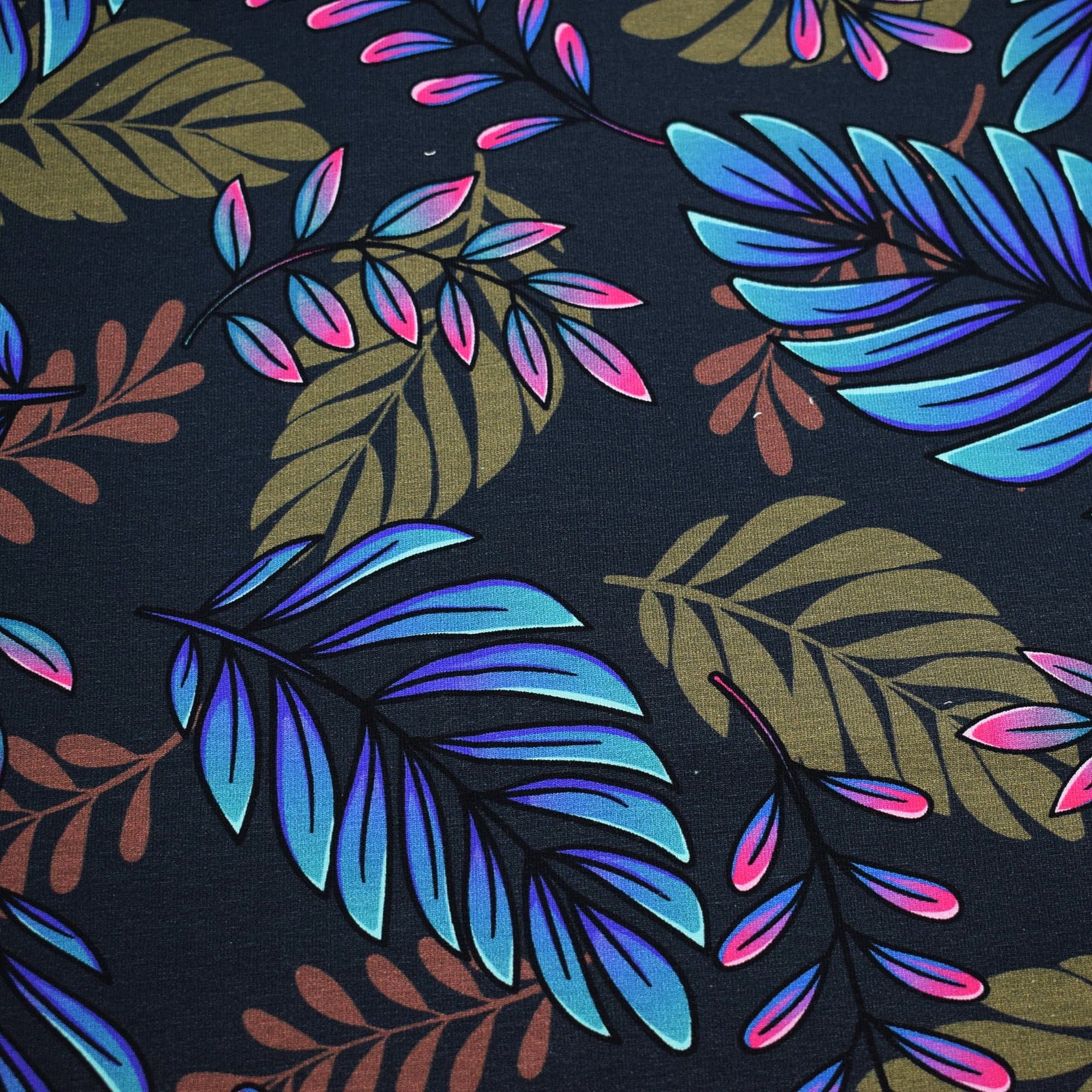 Reststück: French Terry Druck "Joy" - große Blätter/Wedel auf dunkelblauem Hintergrund | KATINOH; ca. 1,0m