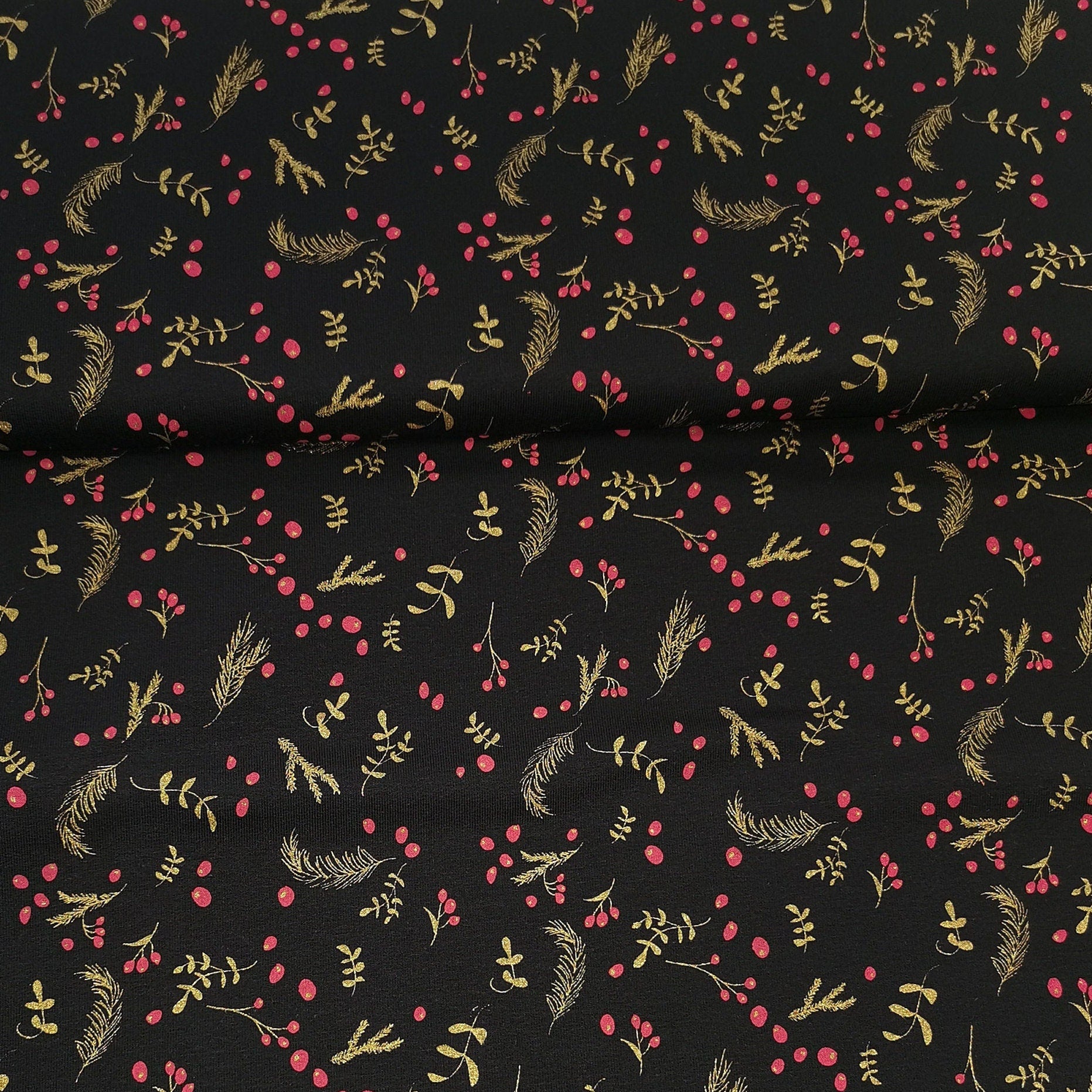 Reststück: schwarzer weihnachtlicher Bio Jersey Stoff mit rot goldenen Applikationen Blättern Zweigen Früchten, Weihnachten; ca. 1,2m