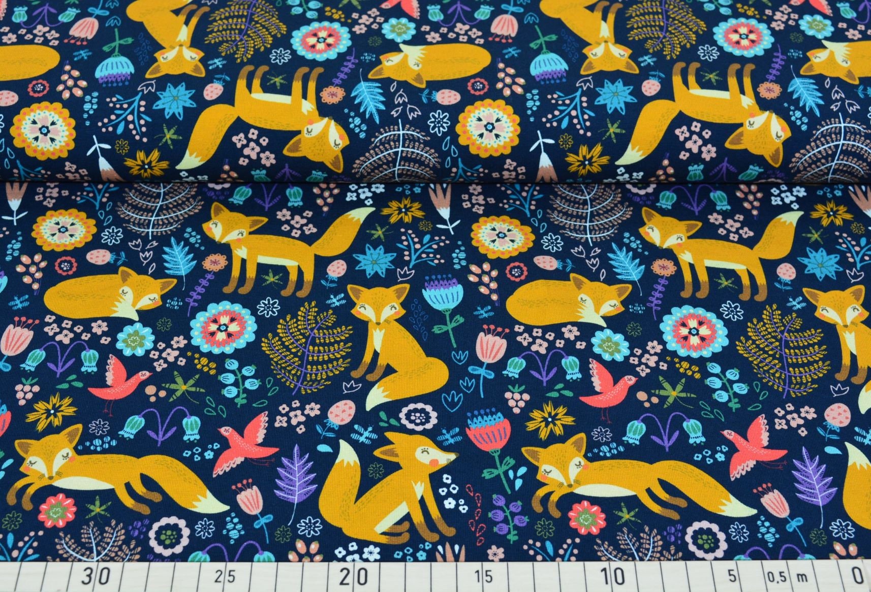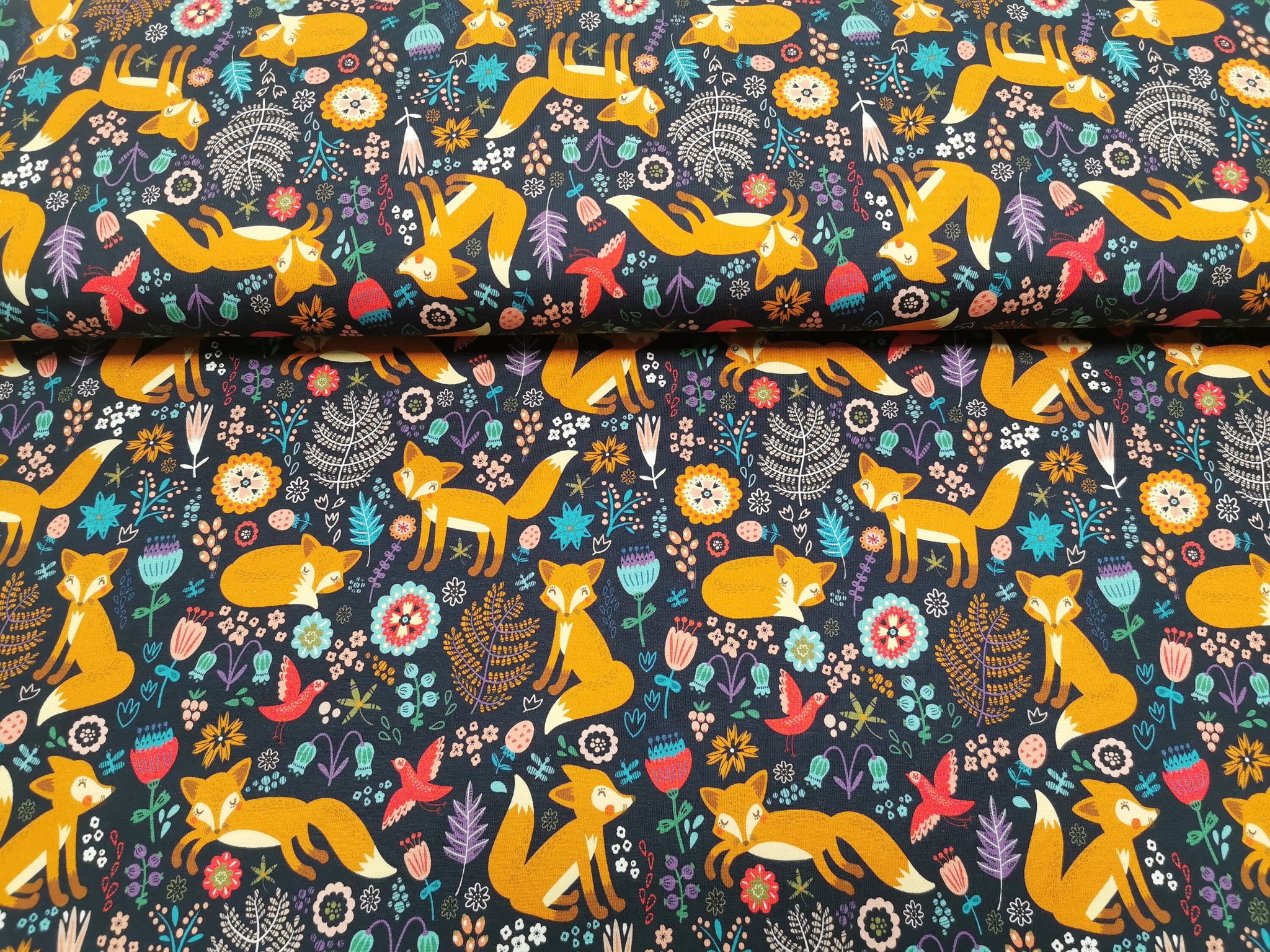 Sweat Stoff Druck orangener Fuchs mit Blüten mit Vögeln, Blüten und Farnen auf marineblauem Hintergrund