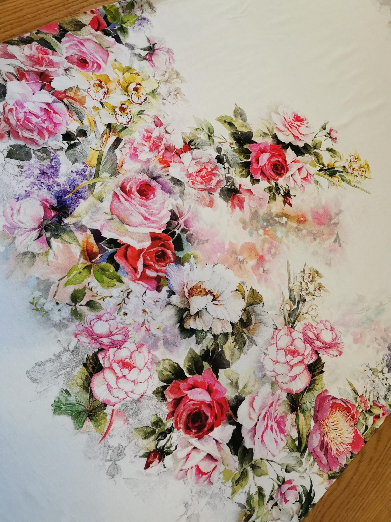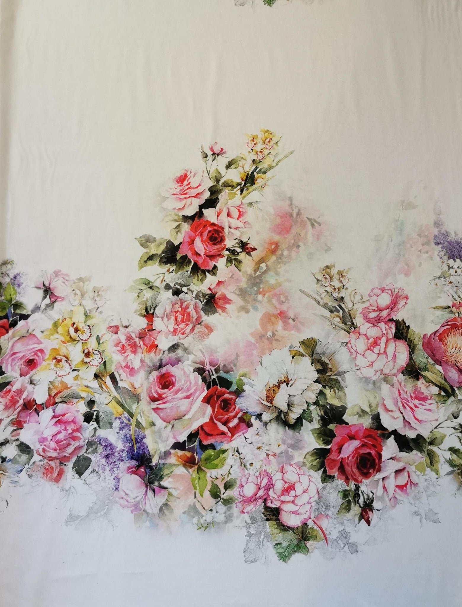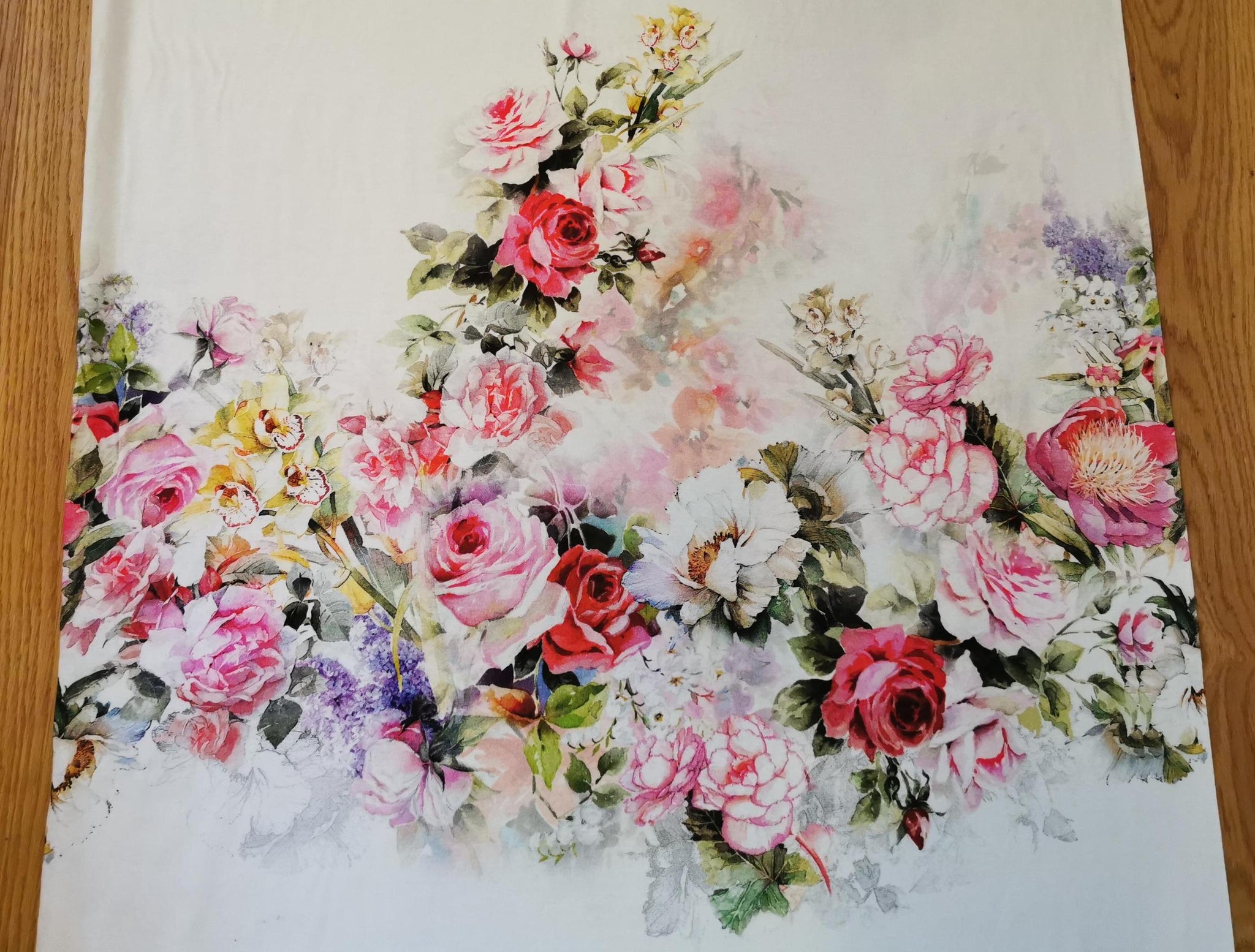 Viskosejersey Stoff Panel "Blumenstrauß" rote und rosa Rosen ca. 0,75m lang