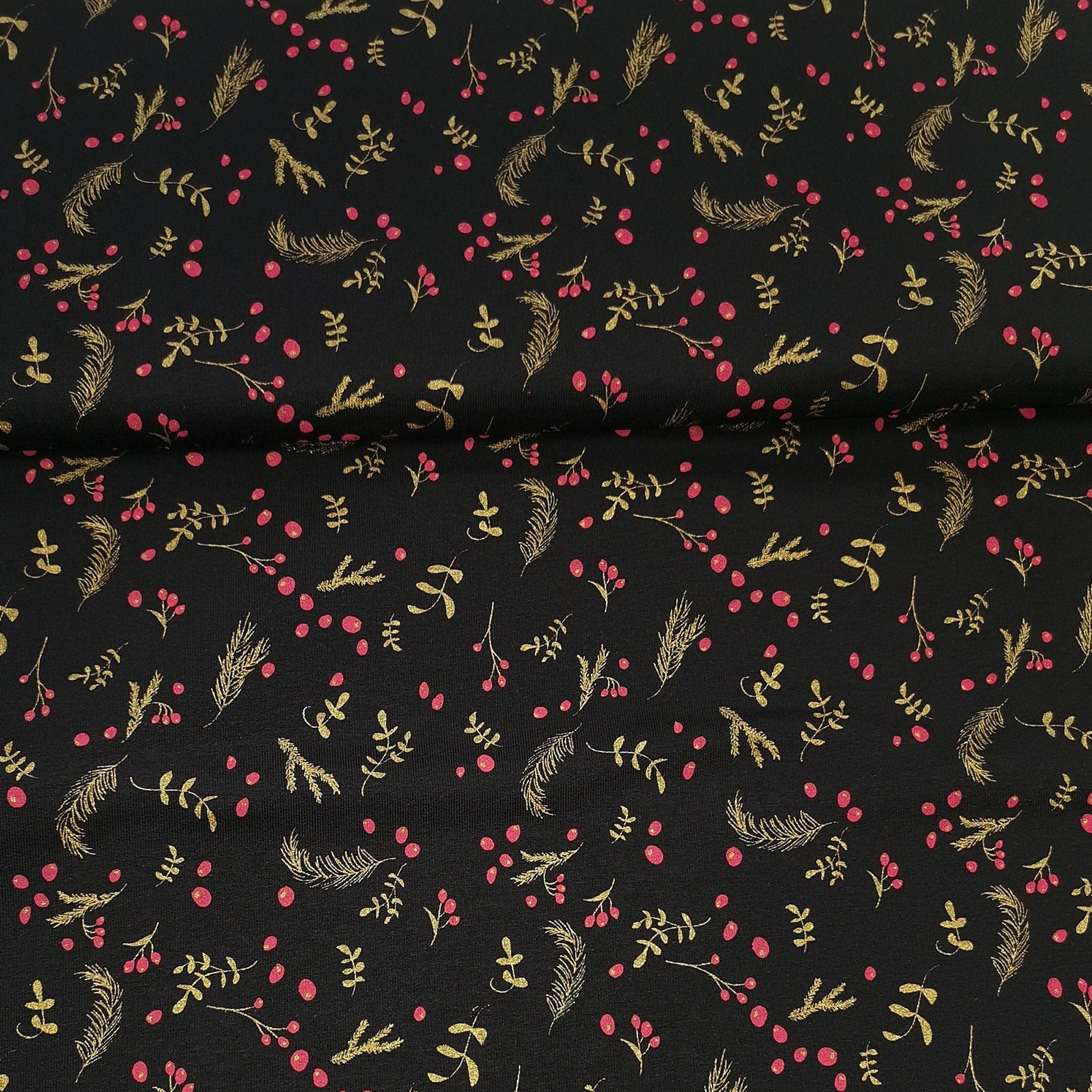 Zuschnitte: schwarzer weihnachtlicher Bio Jersey Stoff mit rot goldenen Applikationen Blättern Zweigen Früchten, Weihnachten | Lillestoff;